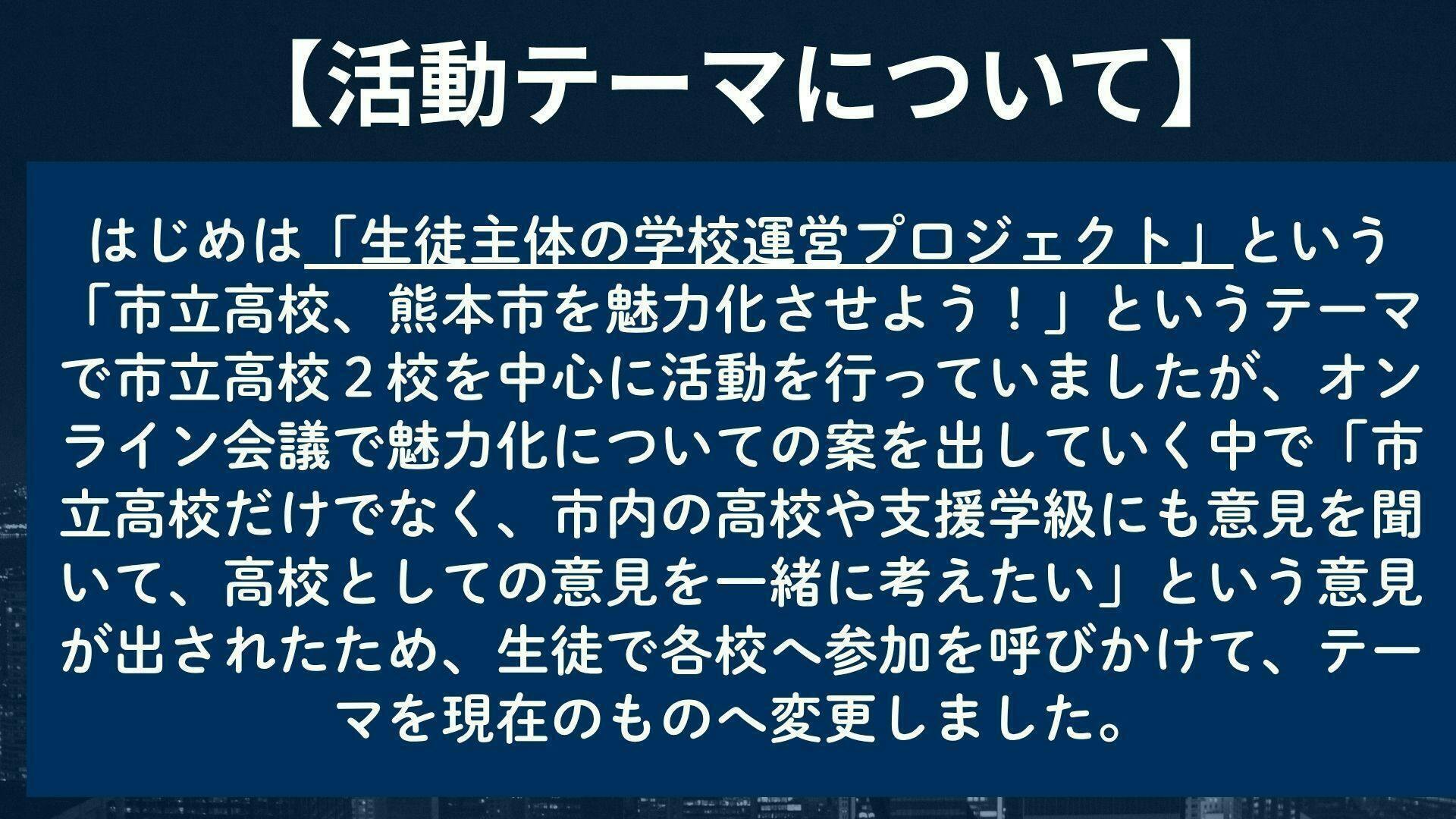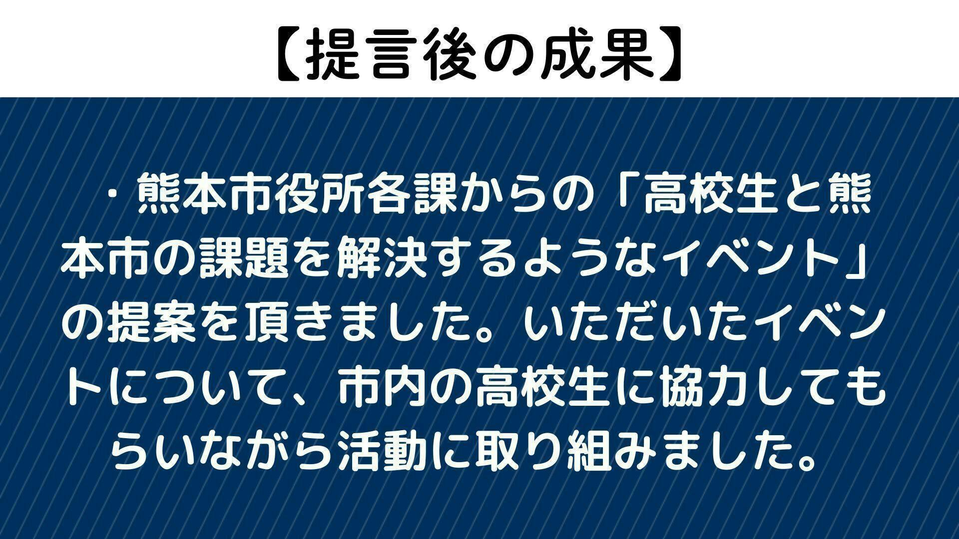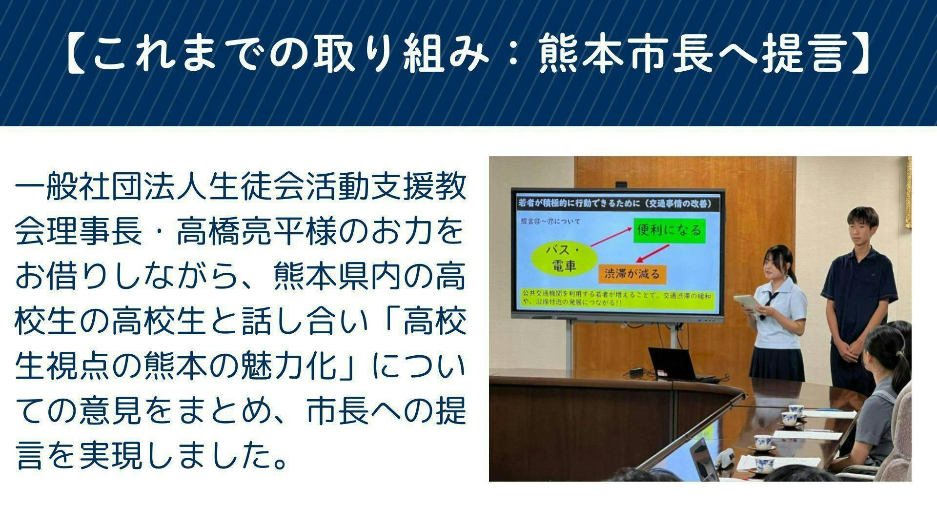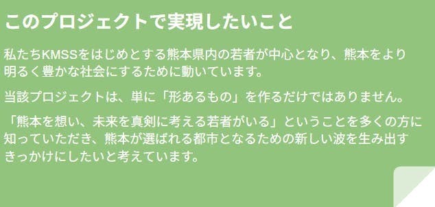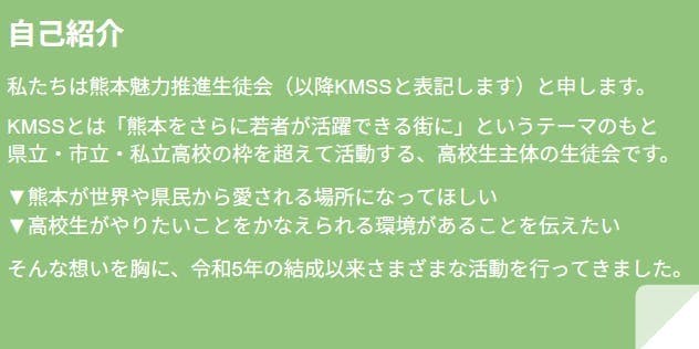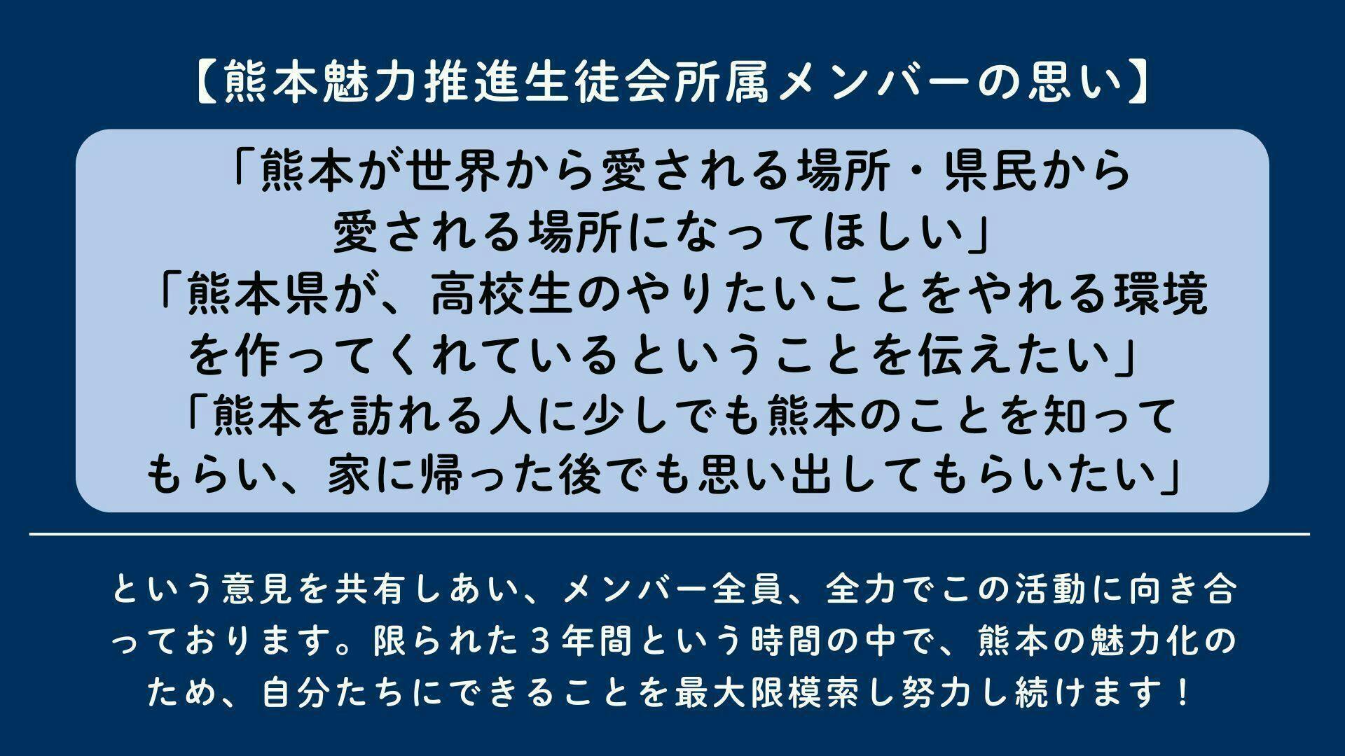 この事業を完遂することで、熊本の市民県民だけではなく熊本県内外・国内外の方々に、熊本県のKMSSをはじめとする多くの若者が、自身の住み暮らすまちをより良くしたいと考え行動に移しているということを知っていただくことで、県内はもちろんのこと県外国外の方々にも、熊本へ興味関心を持っていただくきっかけとなり、熊本が「選ばれる都市」となることを切に願っております。