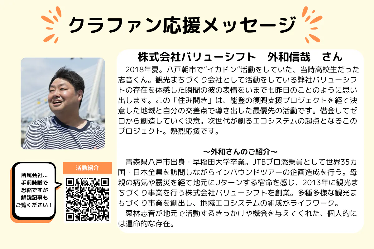 僕が自分らしく在れる仲間と共に、まちとつながる拠点を開放し、自分らしく、気ままで、温かい空間を八戸につくりたい。