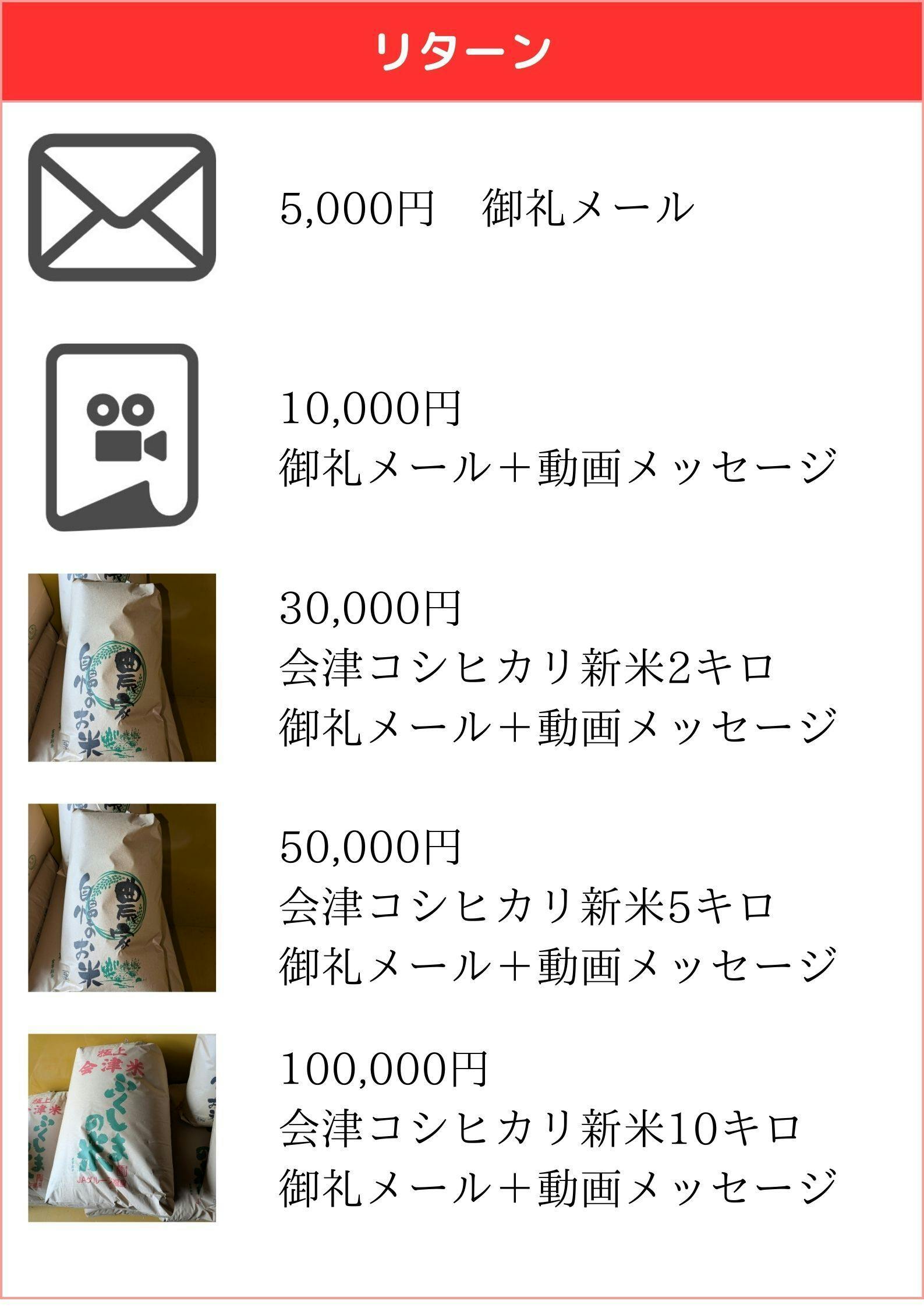 2025年に栽培した喜多方の美味しいコシヒカリ米を収穫後11月に新米を30,000円以上ご支援いただいた方にはお送りいたします。