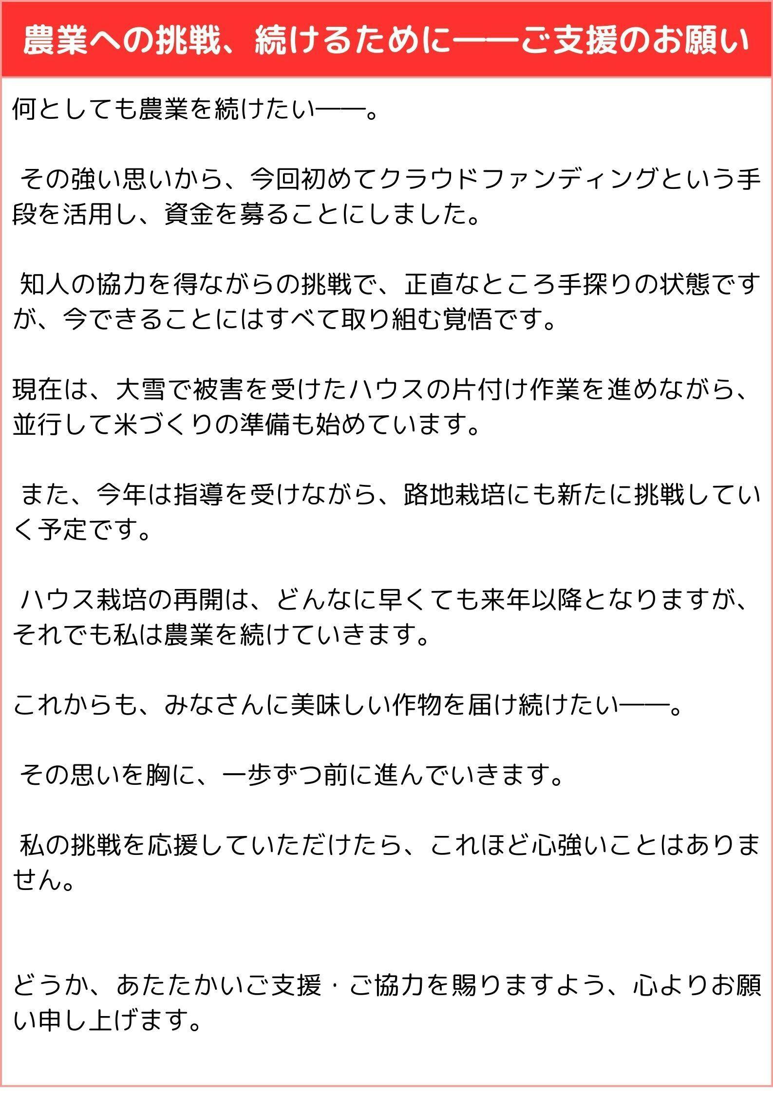 農家として30年の経験を持ち、現在は米とミニトマトを栽培する複合経営を行っています。ミニトマトはビニールハウス5棟で栽培し、年間30,000パックを出荷していました。