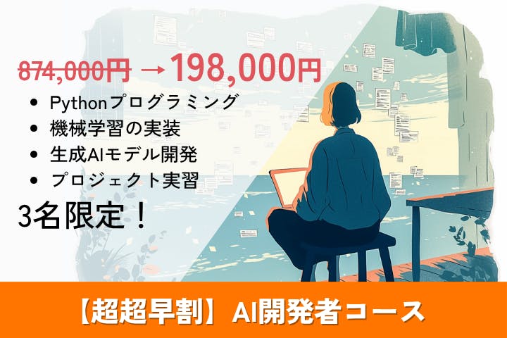 通常価格から大幅割引で、AIエンジニアやデータサイエンティストになるための本格的なコースが受講できる特別枠。限定人数のみの特別価格なので、どうぞお早めに。