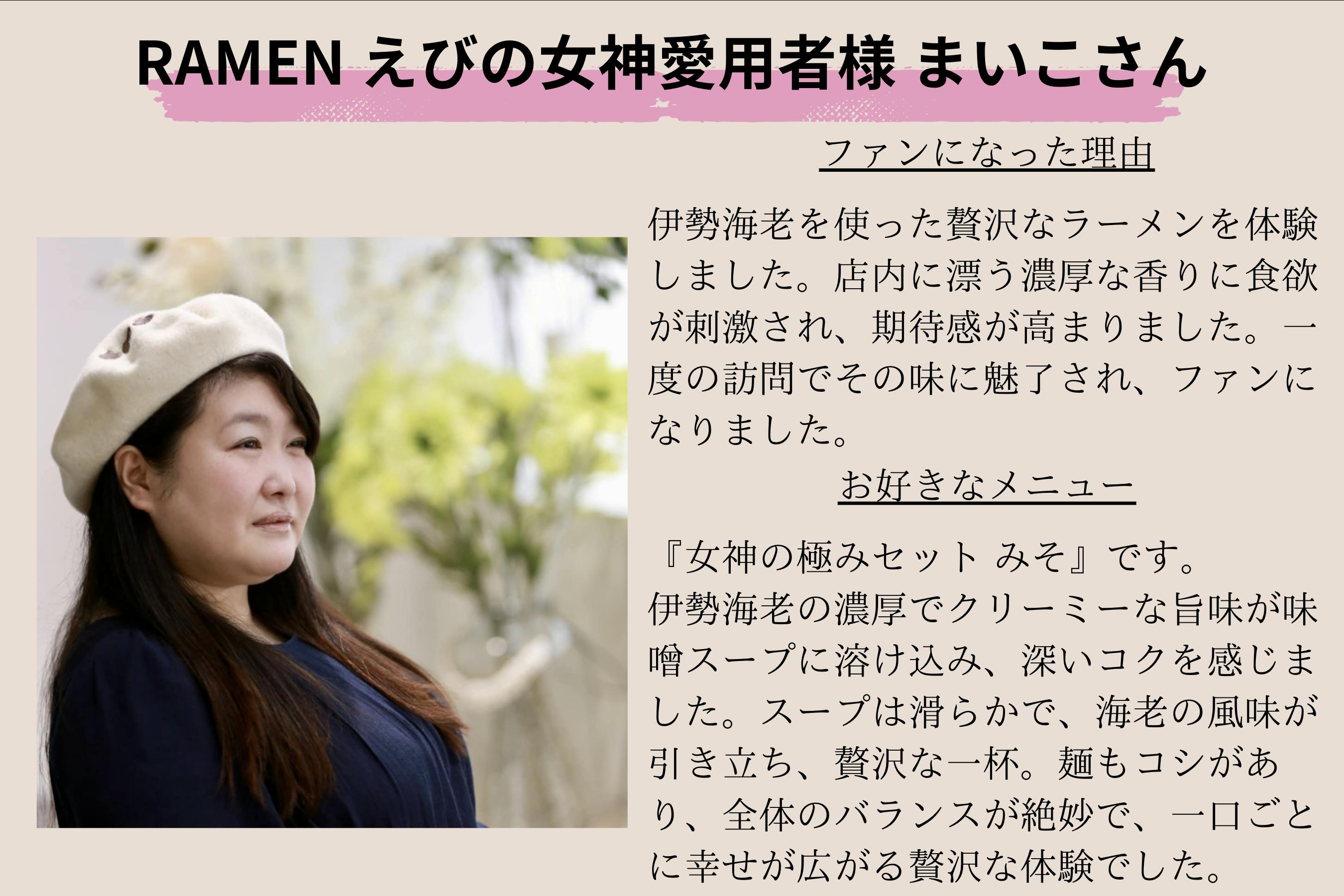 日々のラーメンに対する情熱には驚かされることだらけで本当に助かっていますし、今後もRAMEN えびの女神を盛り上げていきたいと思っています。