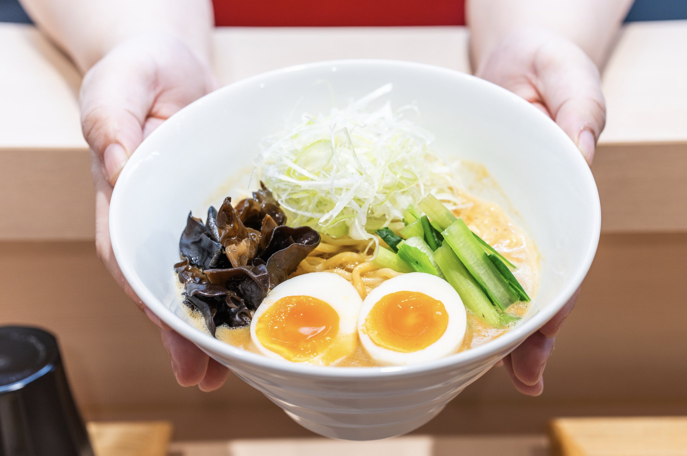 トッピングは、伊勢海老やアワビの他、キクラゲやたっぷりの白髪ネギと小松菜。半熟の味付け玉子はとろとろの黄身で美味しさは満点。