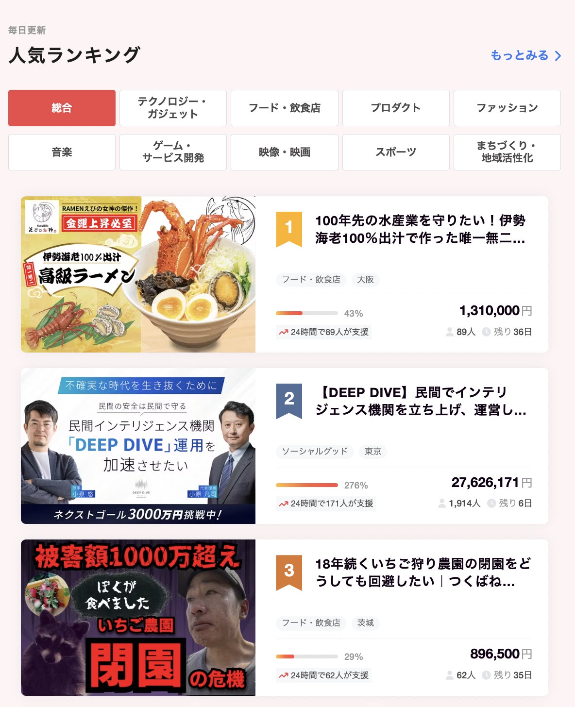 初めての経験なので不安の中からスタートしたクラウドファンディングですが、5時間経たずして80人もの方からご支援を頂戴し、CAMPFIREの総合部門で1位になりました!