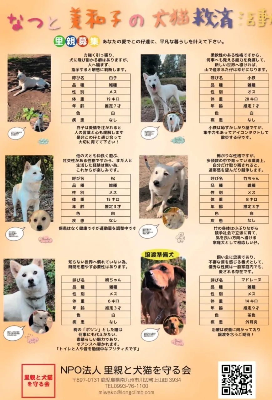 私たち、NPO法人里親と犬猫を守る会の保護施設は、鹿児島県の人里離れた山奥で、保護犬猫9頭の里親様を探しながら、次に行政が殺処分する犬猫を1頭でも多く迎えて救済活動を続ける小さなボランティア団体です。