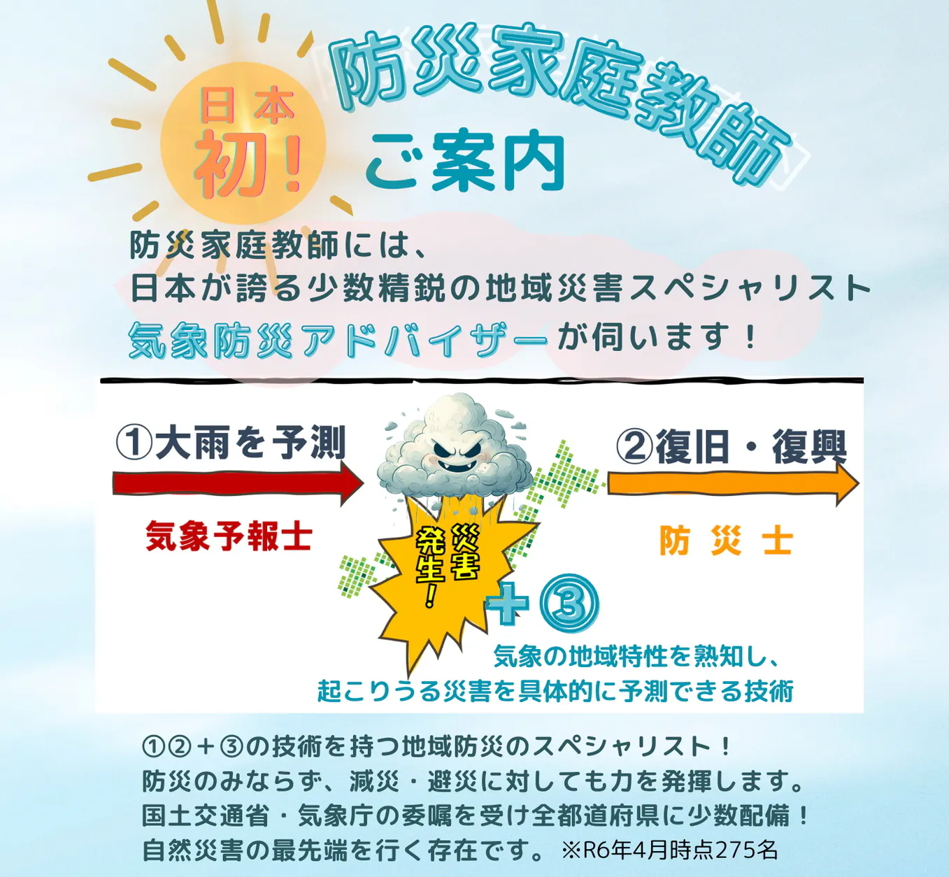 私たちの「防災家庭教師」は、国土交通省が認めた“気象防災アドバイザー”が担当し、発災前から復旧復興までの専門知識を持っています。