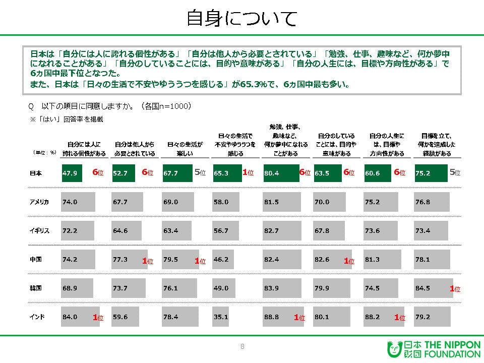 日本財団の18歳意識調査によると、多くの若者が「自分は他者から必要とされていない」と感じていることが報告されています。このような自己肯定感の低さは、社会とのつながりを感じられず、孤独感や生きづらさを増幅させる要因となっています。