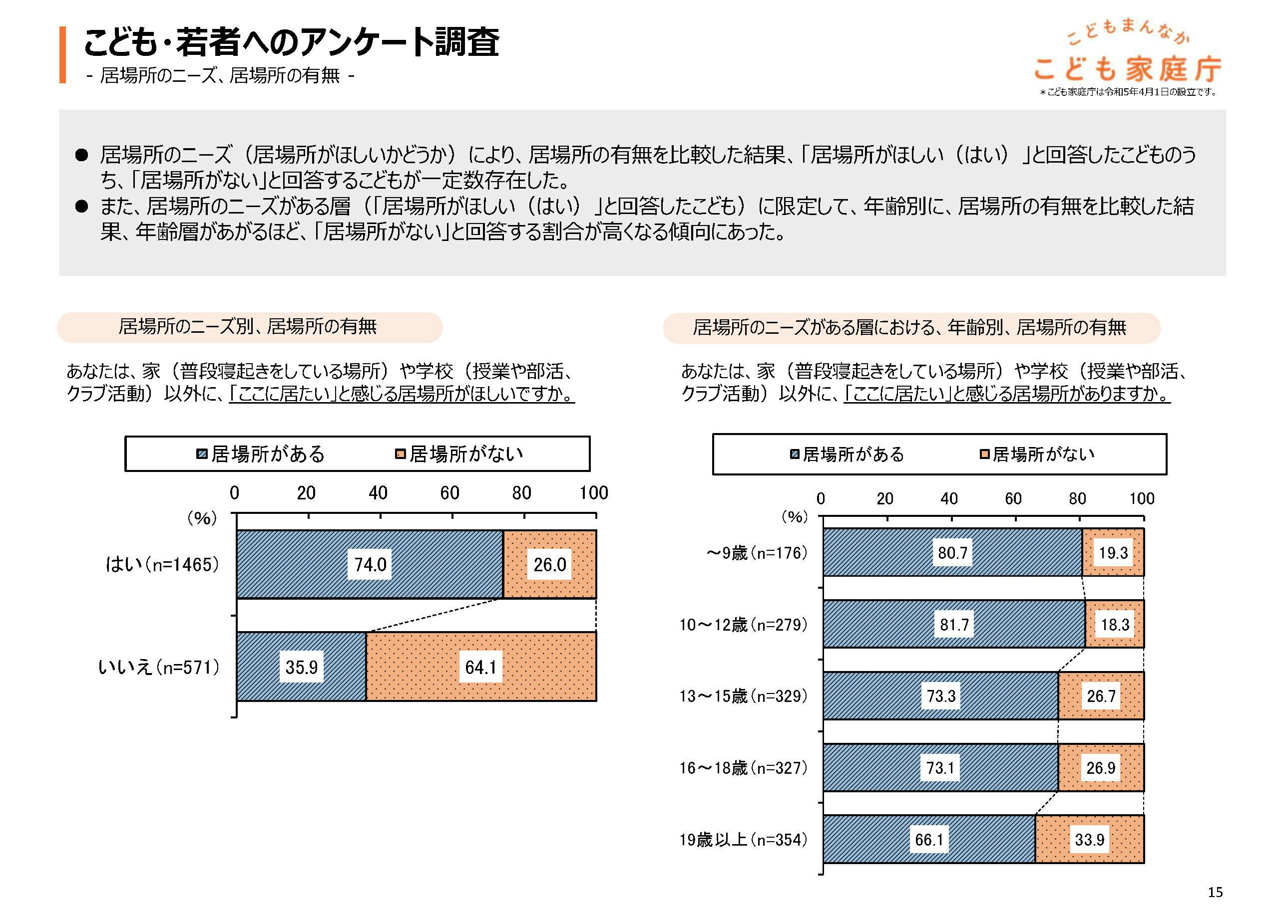 内閣官房の「こどもの居場所づくりに関する調査研究 報告書概要」では、こども・若者の居場所についての実態が報告されています。この調査によれば、こども・若者の居場所に関するニーズがある一方で、実際には居場所がないと感じている若者も存在することが示されています。
