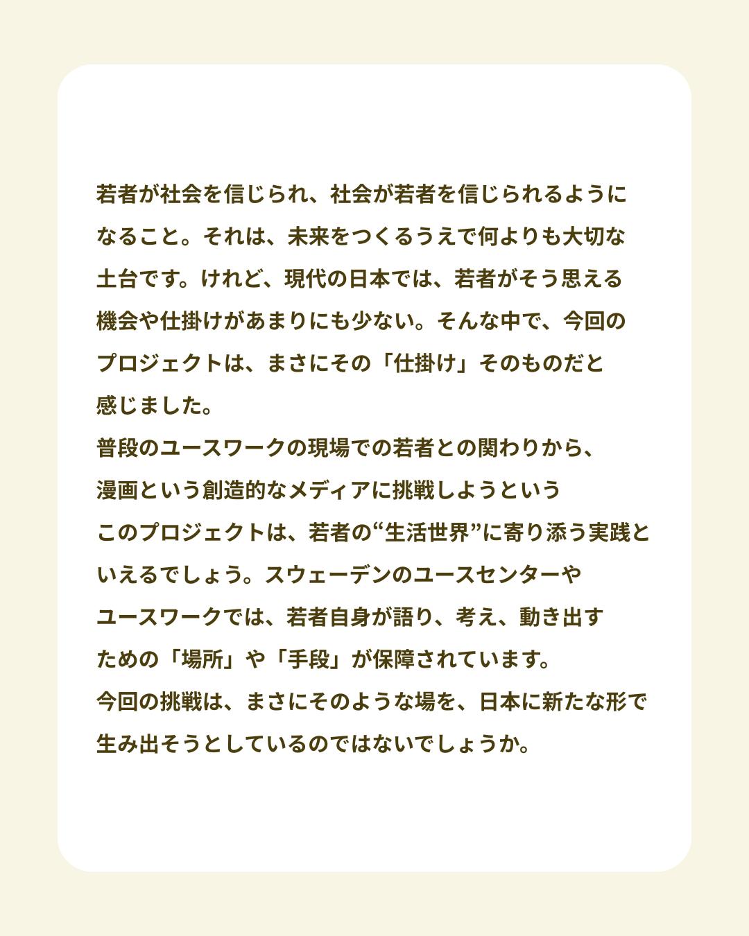 普段のユースワークの現場での若者との関わりから、漫画という創造的なメディアに挑戦しようというこのプロジェクトは、若者の“生活世界”に寄り添う実践といえるでしょう。スウェーデンのユースセンターやユースワークでは、若者自身が語り、考え、動き出すための「場所」や「手段」が保障されています。今回の挑戦は、まさにそのような場を、日本に新たな形で生み出そうとしているのではないでしょうか。