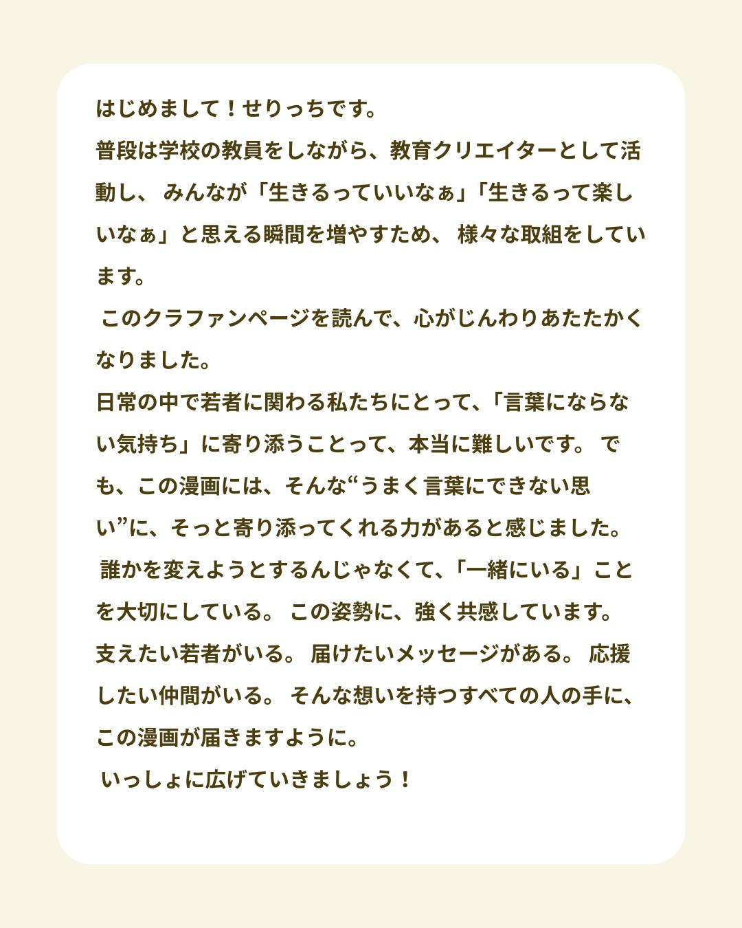誰かを変えようとするんじゃなくて、「一緒にいる」ことを大切にしている。 この姿勢に、強く共感しています。 支えたい若者がいる。 届けたいメッセージがある。 応援したい仲間がいる。 そんな想いを持つすべての人の手に、この漫画が届きますように。 いっしょに広げていきましょう!