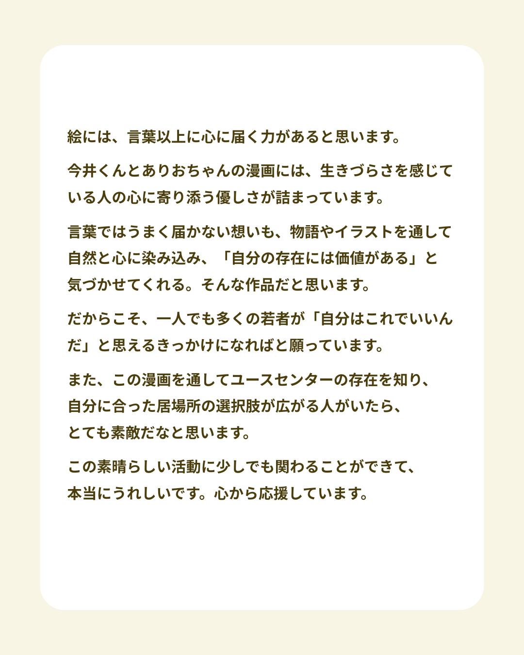 また、この漫画を通してユースセンターの存在を知り、自分に合った居場所の選択肢が広がる人がいたら、とても素敵だなと思います。