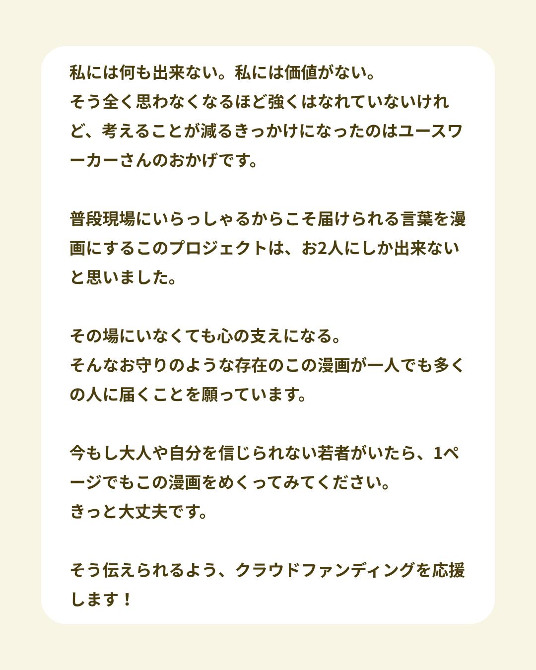 普段現場にいらっしゃるからこそ届けられる言葉を漫画にするこのプロジェクトは、お2人にしか出来ないと思いました。