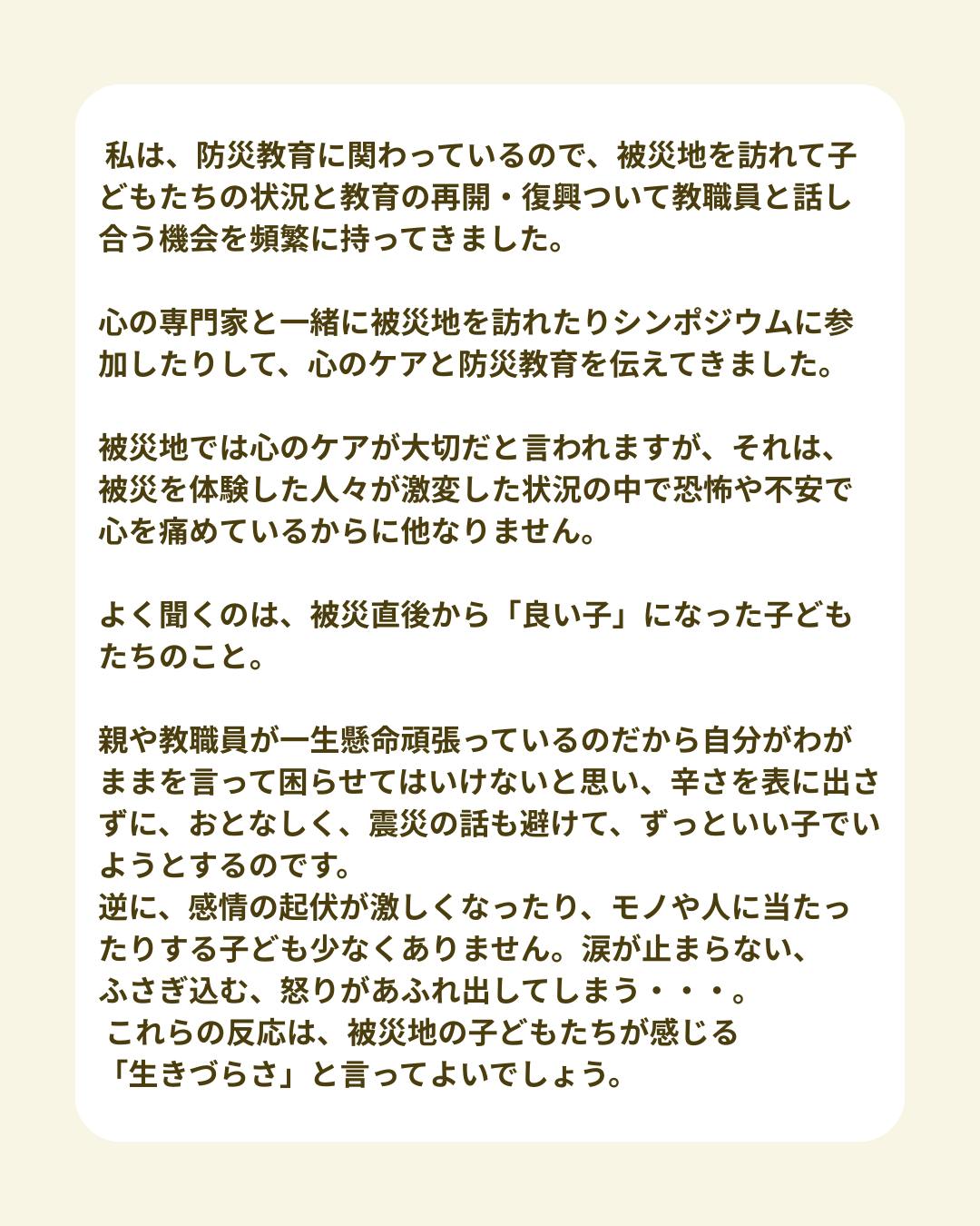 私は、防災教育に関わっているので、被災地を訪れて子どもたちの状況と教育の再開・復興ついて教職員と話し合う機会を頻繁に持ってきました。