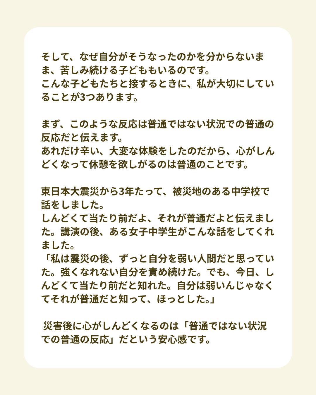 災害後に心がしんどくなるのは「普通ではない状況での普通の反応」だという安心感です。