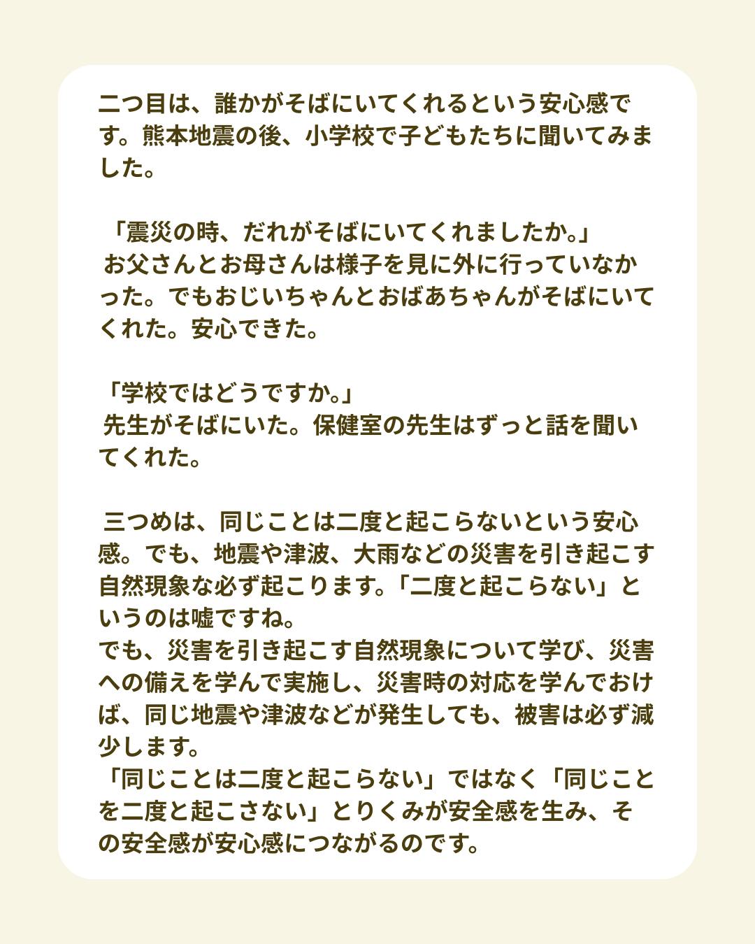 二つ目は、誰かがそばにいてくれるという安心感です。熊本地震の後、小学校で子どもたちに聞いてみました。