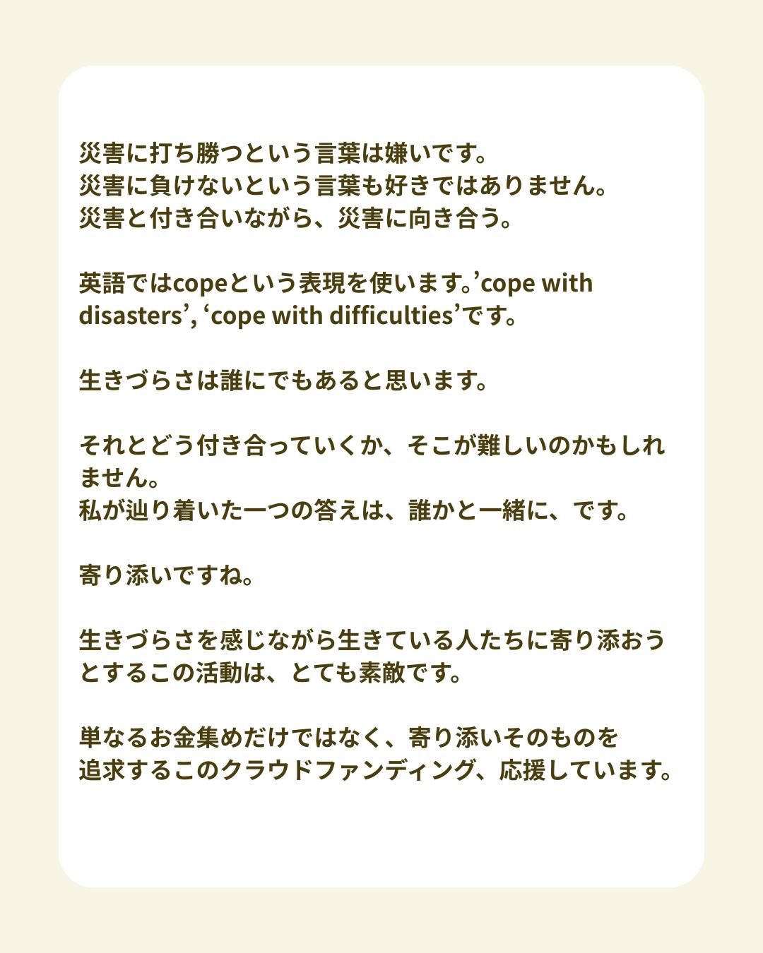 単なるお金集めだけではなく、寄り添いそのものを追求するこのクラウドファンディング、応援しています。