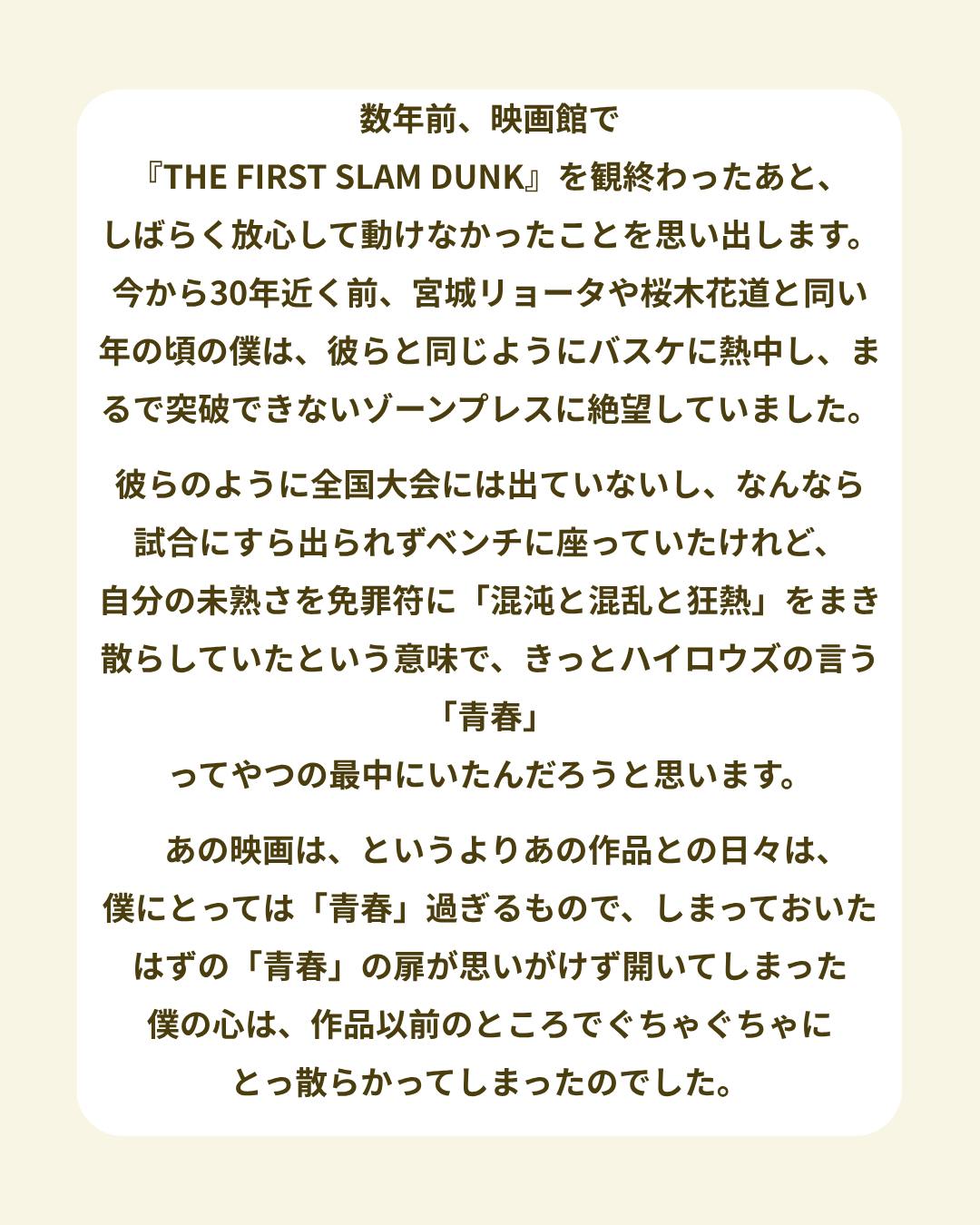 数年前、映画館で『THE FIRST SLAM DUNK』を観終わったあと、しばらく放心して動けなかったことを思い出します。