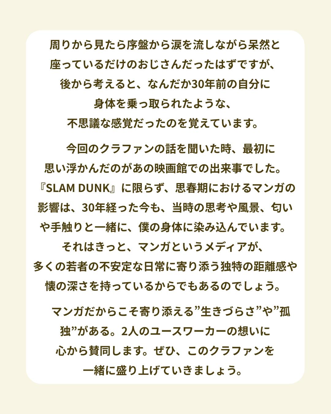 今回のクラファンの話を聞いた時、最初に思い浮かんだのがあの映画館での出来事でした。『SLAM DUNK』に限らず、思春期におけるマンガの影響は、30年経った今も、当時の思考や風景、匂いや手触りと一緒に、僕の身体に染み込んでいます。それはきっと、マンガというメディアが、多くの若者の不安定な日常に寄り添う独特の距離感や懐の深さを持っているからでもあるのでしょう。