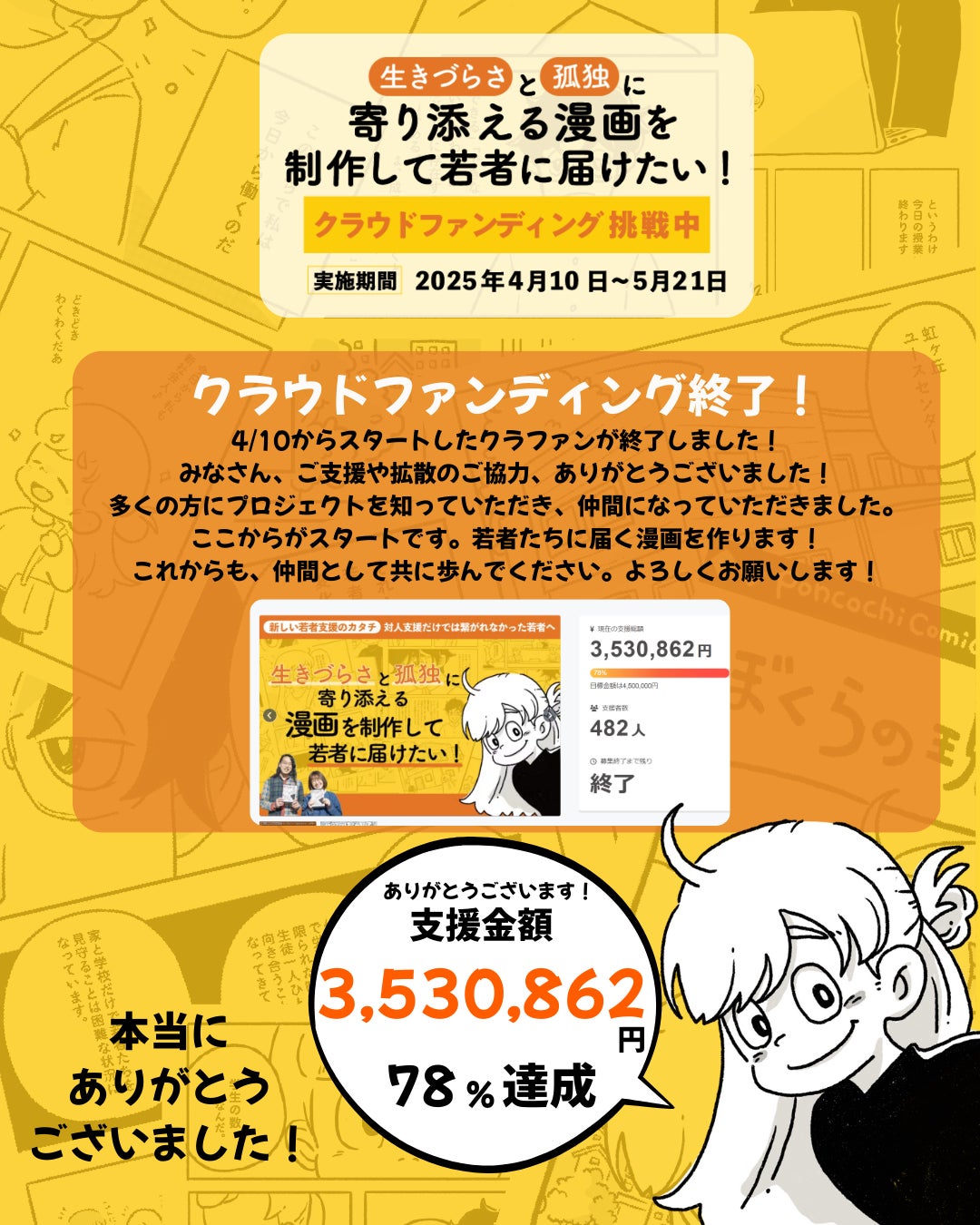 みなさまクラウドファンディングへのご協力、本当にありがとうございました!目標金額には到達しなかったものの、みなさまのおかげで多くの支援をいただき、漫画制作をスタートさせられる状態になりました。