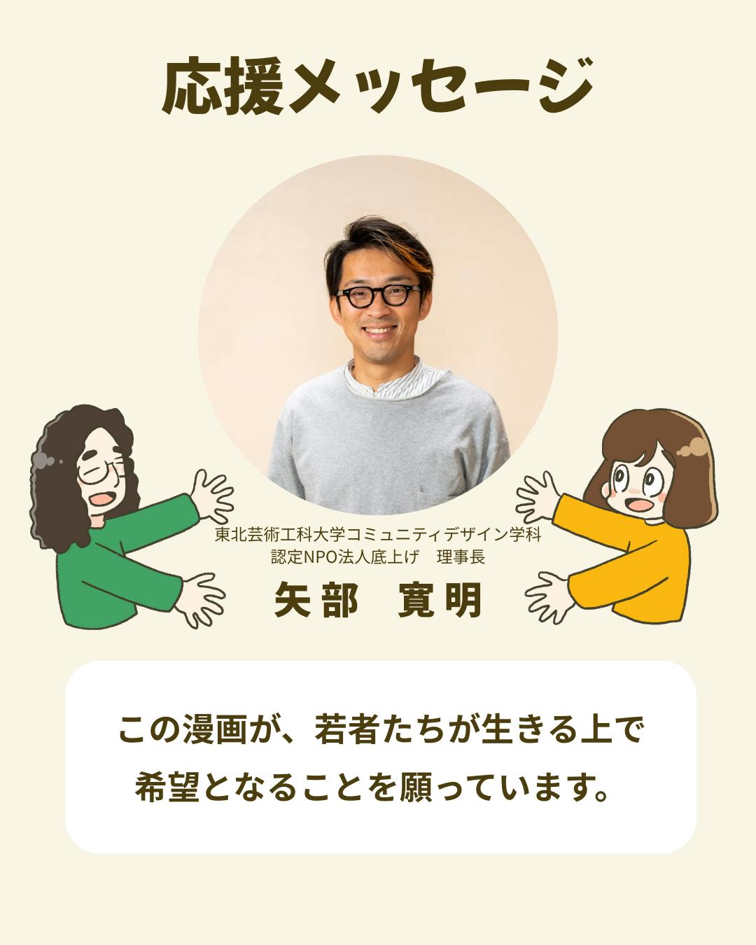 クラウドファンディングを通して、たくさんの応援の言葉を頂いております。私たちにとって本当に大きな支えになっています。【”生きづらさ”と”孤独”に寄り添える漫画を制作して、若者たちに届けたい!】クラウドファンディング挑戦中応援、拡散よろしくお願いします!ページはコチラからhttps://camp-fire.jp/projects/833603/view?utm_campaign=cp_po_share_c_msg_mypage_projects_showーーーーーーーーーーーーーーーーーーーーーーーーーーーーーーー東北芸術工科大学コミュニティデザイン学科認定NPO法人底上げ 理事長矢部 寛明 さん (矢部 寛明 )矢部は、本プロジェクトに賛同します。今井くんとはまだ彼が大学生のころに出会いました。10年以上前のことです。当時から一貫して彼の軸にあるのは若者をエンパワメントすること。教員でもなく、親でもない、曖昧な関係であるからこそリアルな若者像が見えてきたのではないでしょうか。ご存知の通り、日本社会における若者を取り巻く環境は決して良いとは言えません。この漫画が、そんな若者たちが生きる上で希望となることを願っています。