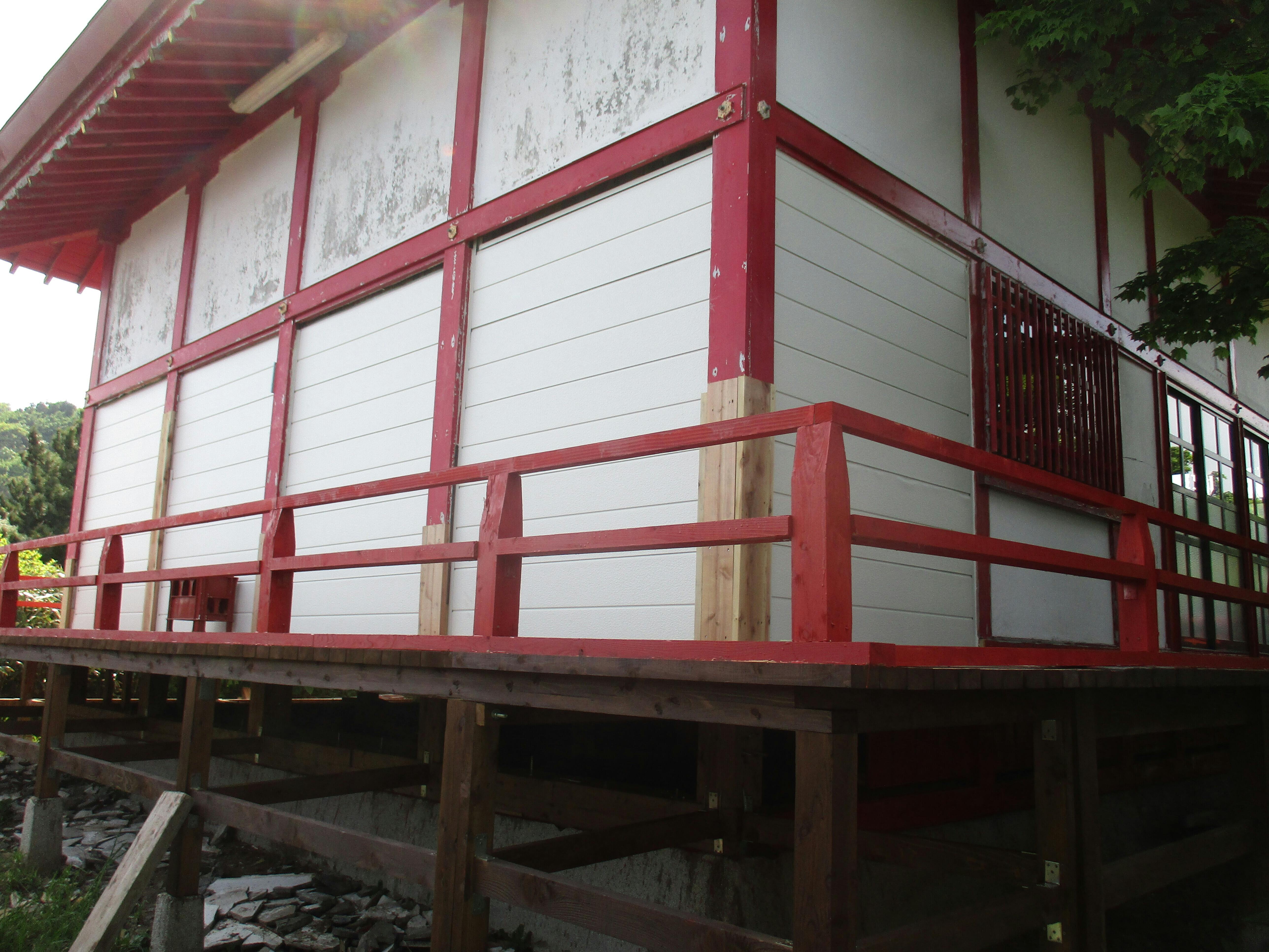 こんにちは!島の文化財の宮津弁天宮です。回廊の裏からの島が、絶景です。是非ともご覧ください。今は見えています木目の材料もペンキで仕上げられています。完成しています。明上雅孝。