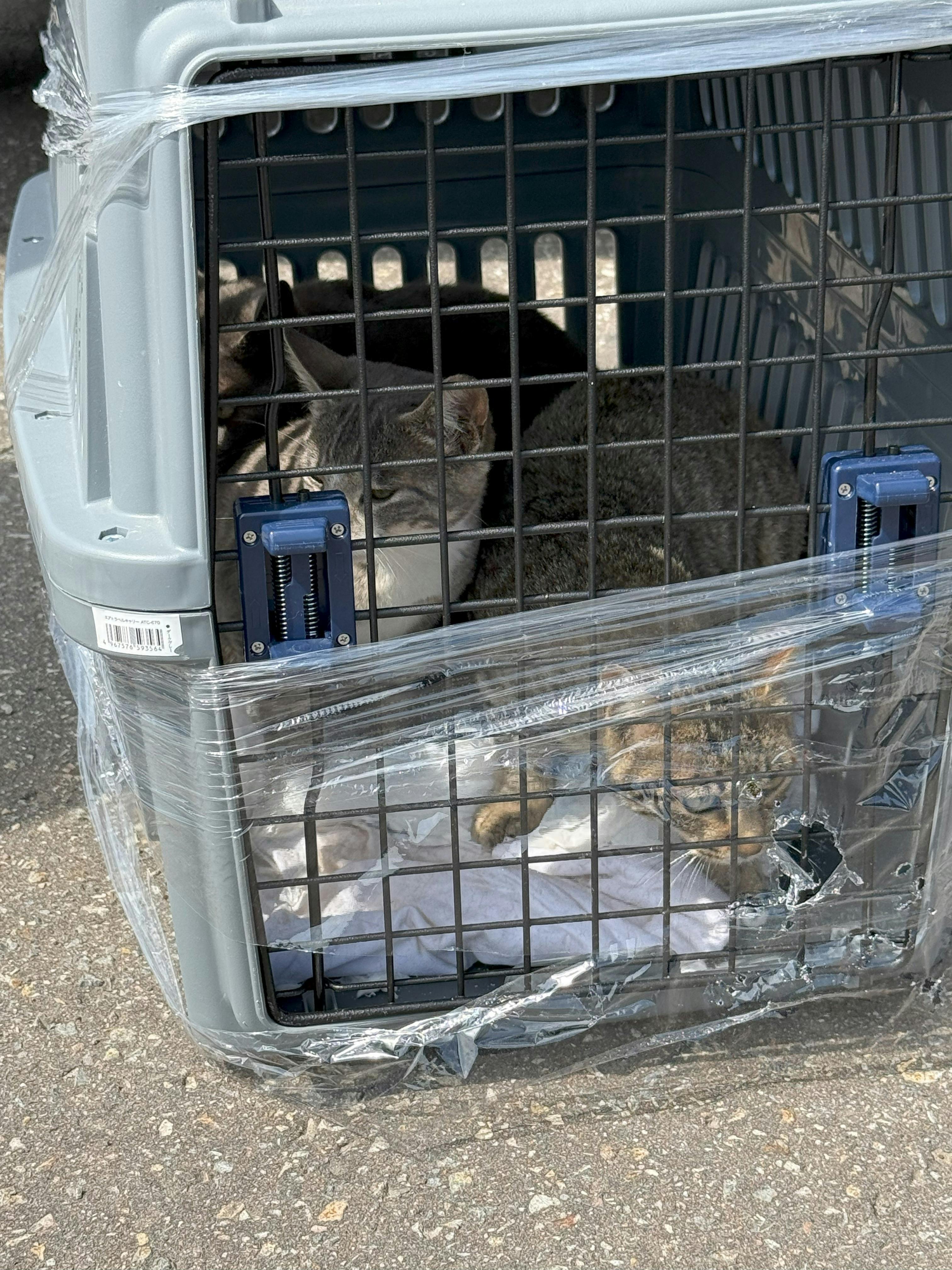 こんにちは!会社の保護猫3匹が22日には車でケージでフェリーで江差に渡り保護センターへ渡しました。5匹いたのですが3匹だけは捕まえれました。後の2匹は保護センターが23日に島に渡り24日にフェリーで江差に連れて行きました、軽4輪で一人で来てくれました。明上雅孝。
