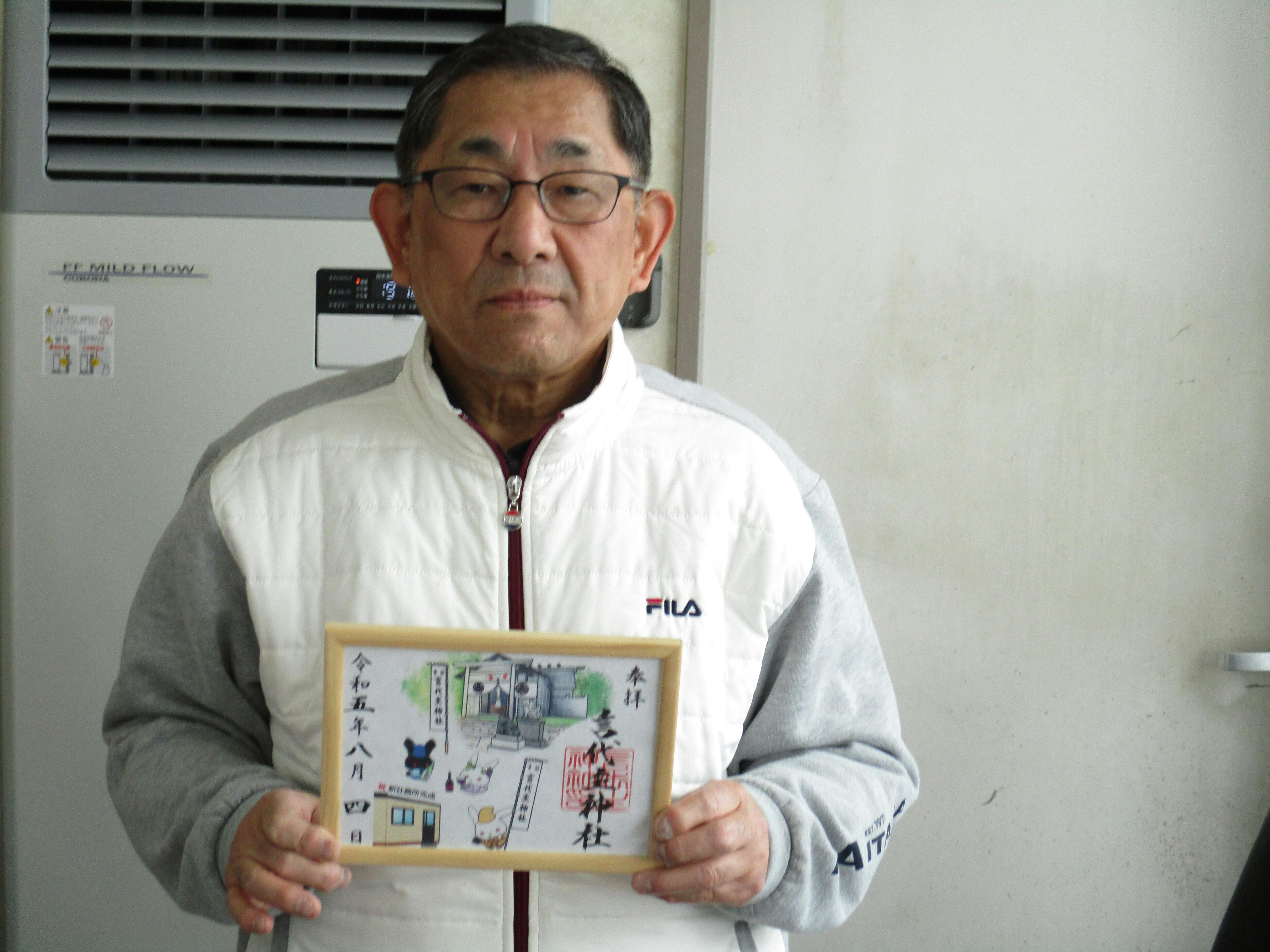 今晩は、令和4年のクラウドファンディングを始めて令和5年にようやく完成した事代主神社の社務所の完成の御朱印です。例大祭の風景、島のウニ、ワインやお酒なども描かれています。4,5センチの各印もこの時からのスタートでした。来島記念で初穂料にて購入されています。1枚1000円で。思い出が多いです。明上雅孝。
