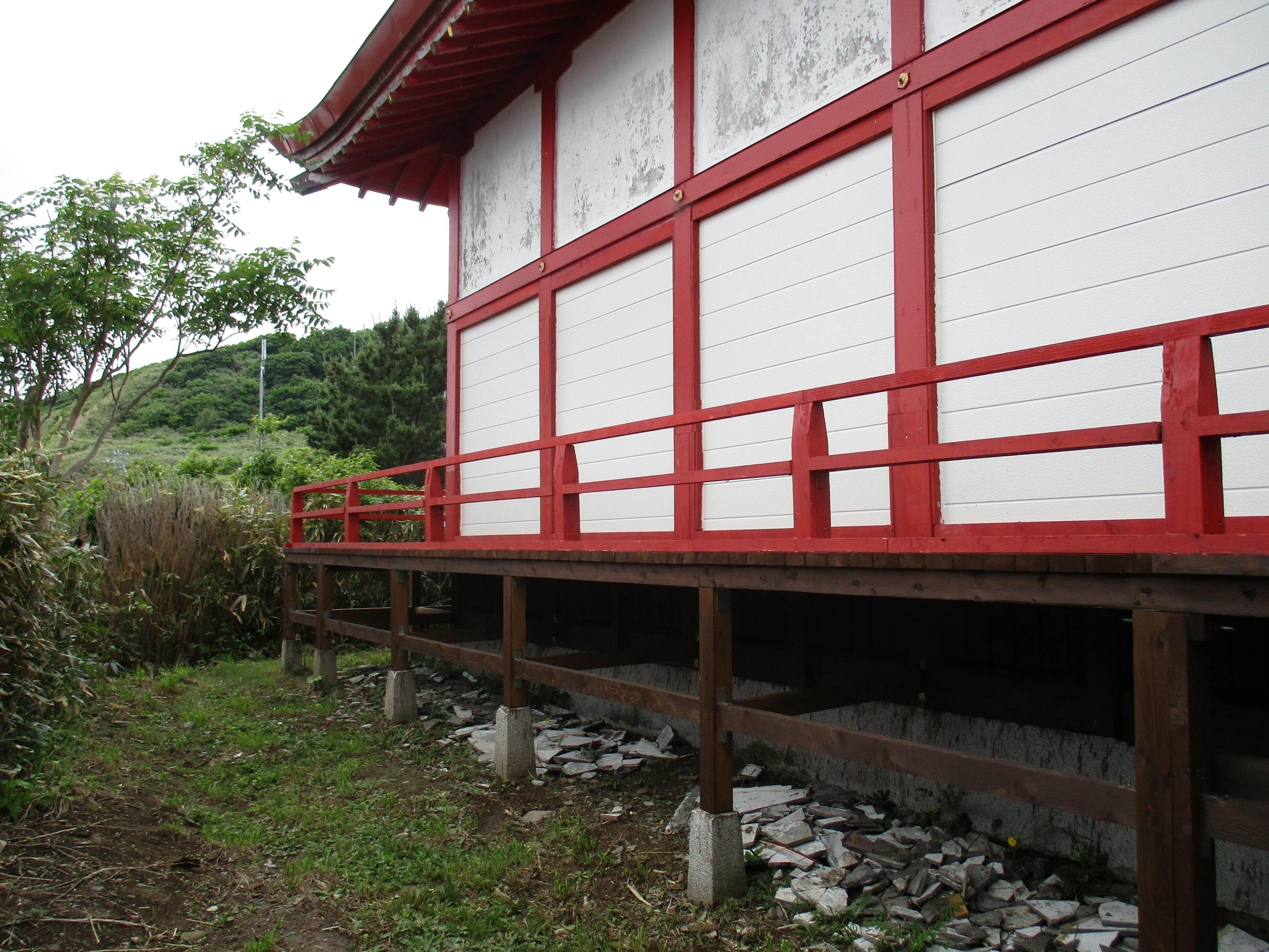 今晩は、島の文化財の宮津弁天宮です、出来上がりました。建物の後ろです、回廊からの絶景をご覧ください。海抜30メートルの岩の上からは見晴らしが素晴らしいです。後世に残せました、案内板に。明上雅孝。
