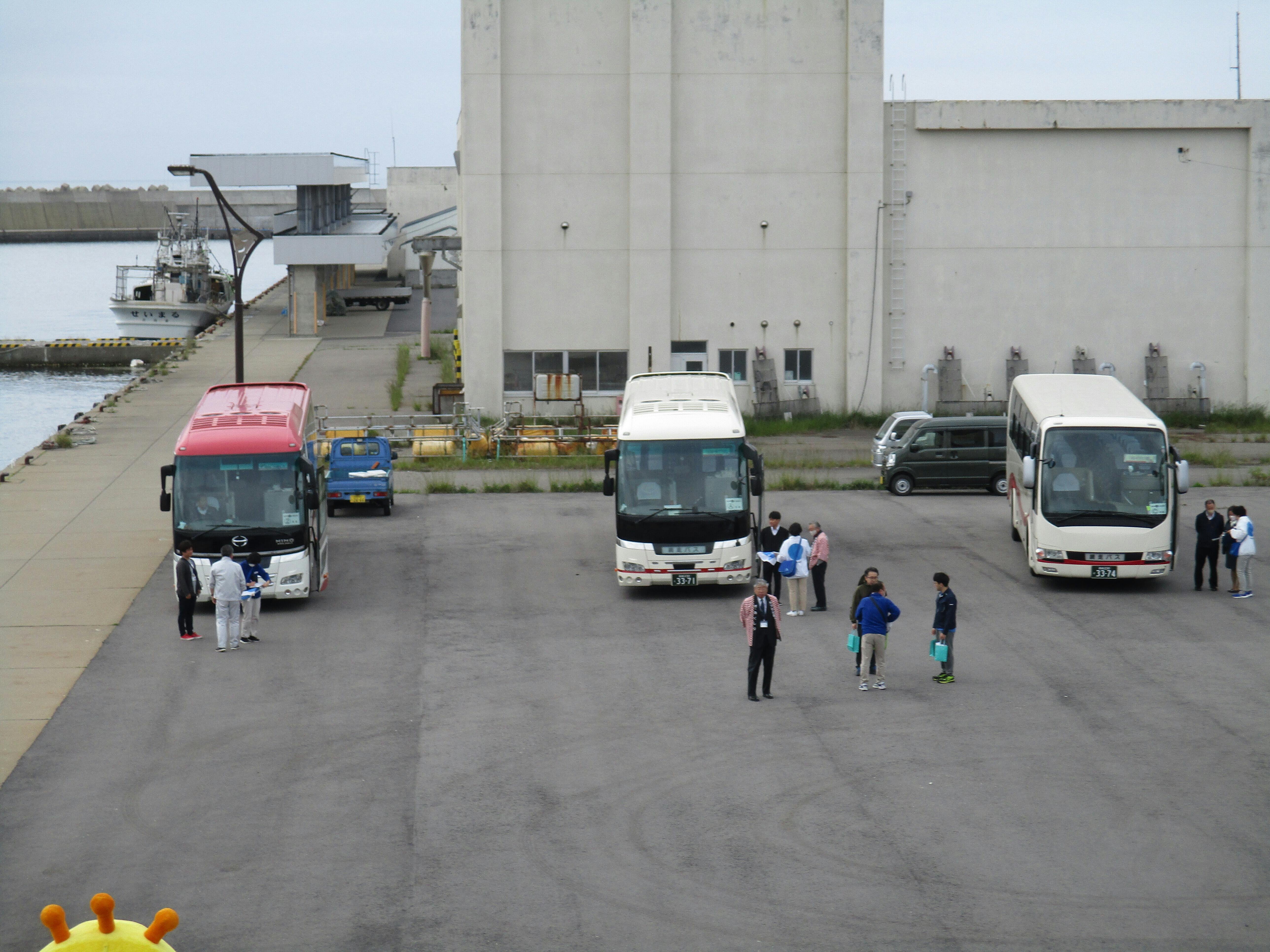 こんにちは!見えていますバスは、クルーズ船が来る前に函館から来てるバスです。前の日に島に入ります、当日にクルーズ船を待ちますが波が高いとテンダーボートが港に入れずに、バスは次の日に空でフェリーで江差港に帰ります、リスクが大きくありますよ。5回は入れませんでした。日程調整は難しいですよ。明上雅孝。