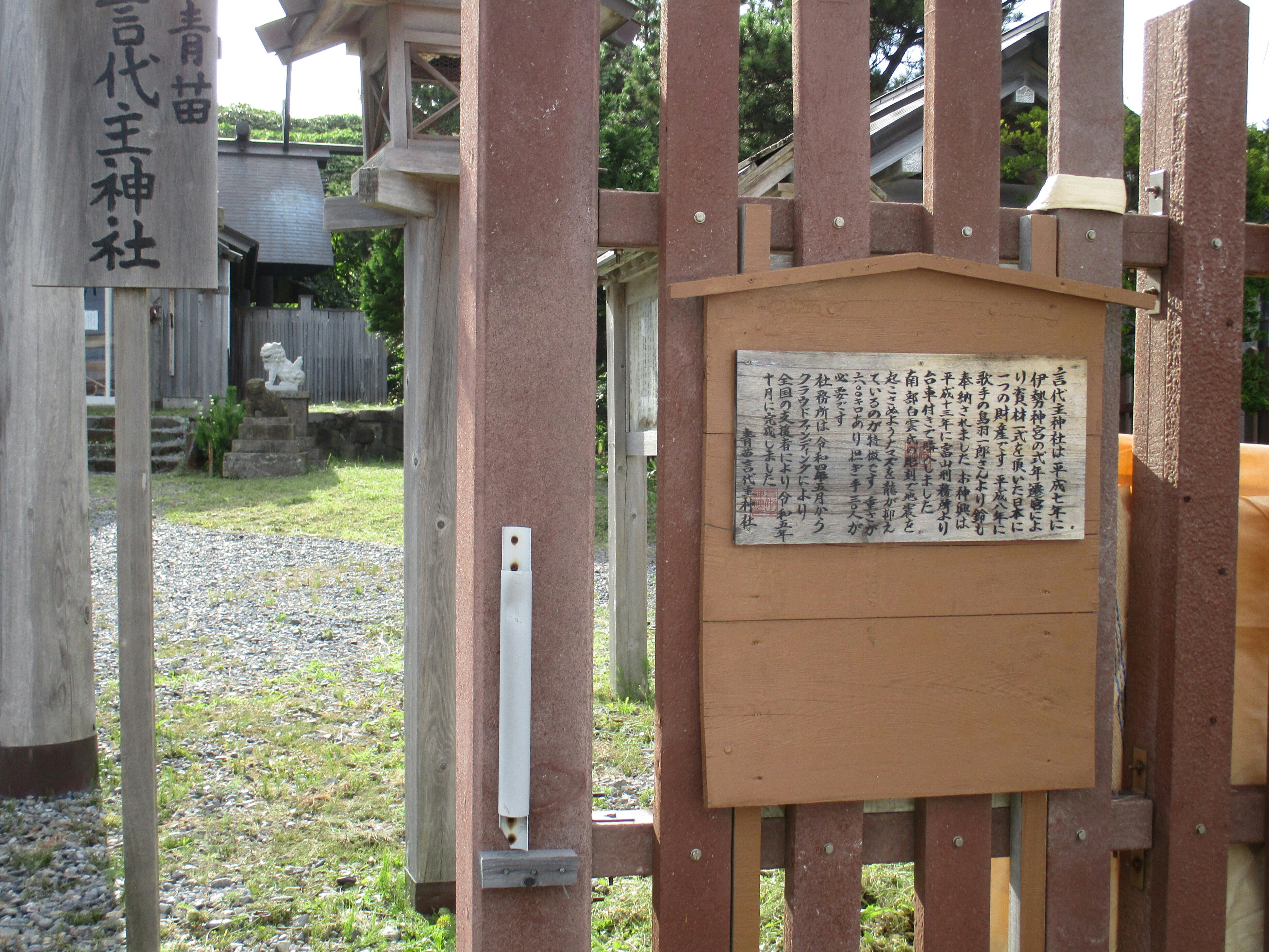 こんにちは!事代主神社の案内板の説明です、神社は伊勢神宮の内宮別宮ツキヨミ宮です、原寸での建設です。お神輿は地震を起こさぬように龍がナマズを抑えてる彫刻入りです、参拝の鈴は歌手の鳥羽一郎さんの奉納で奉納、兄弟船、鳥羽一郎と刻まれています、社務所の完成はクラウドファンデングですと。刻まれています。文字を拡大してペンキで書き、クリアーを塗り、完成したら案内板の交換をします。道路からは目につきやすいです。明上雅孝。