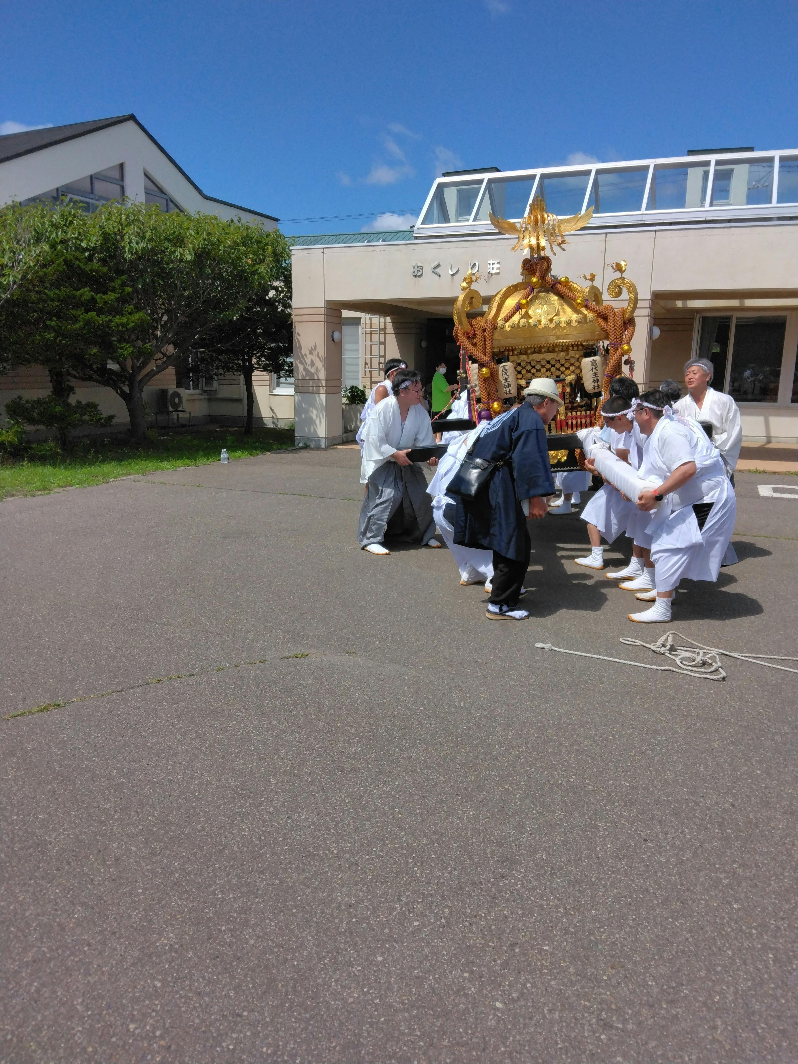 こんにちは!青苗の事代主神社の7年ぶりのお祭りの光景です、老人ホームの前です。8月13日の1日でしたが猿田彦、お神輿、山車が街を練り歩きました。これからは継続は力なりですね。まだ総代長です。早く島の財産を後世に渡したい。明上雅孝。