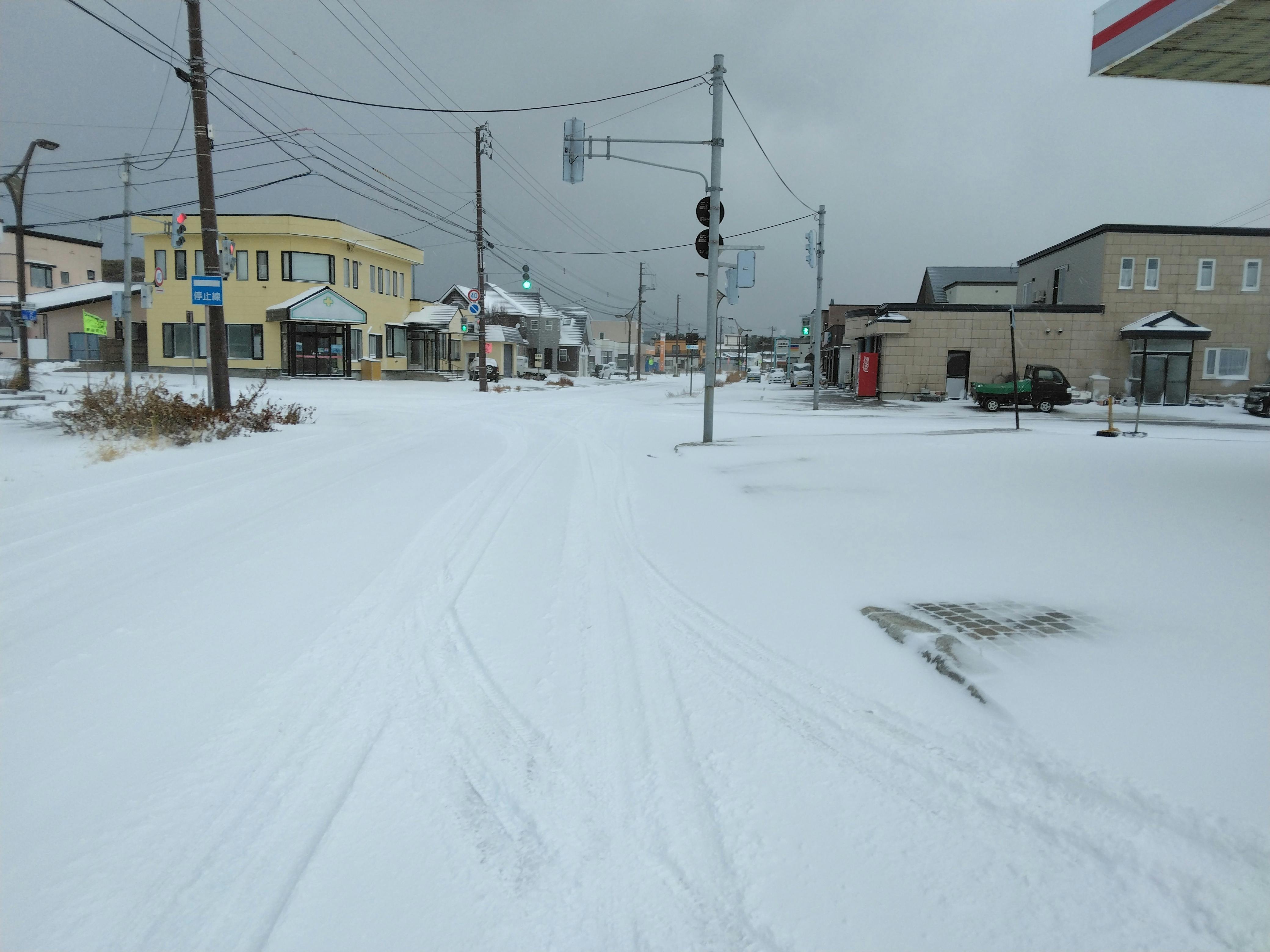 こんにちは!青苗の市街地です、雪は多いです。青苗は自動信号機は1機です。押しボタン式も1機です。昨年は塩害で故障して20日間ぐらいは、消えていましたが、事故はありませんでした。信号機がないとそれ以上にきずかいしました。治って青でも止まってしまいました、私の経験ですが。明上雅孝。