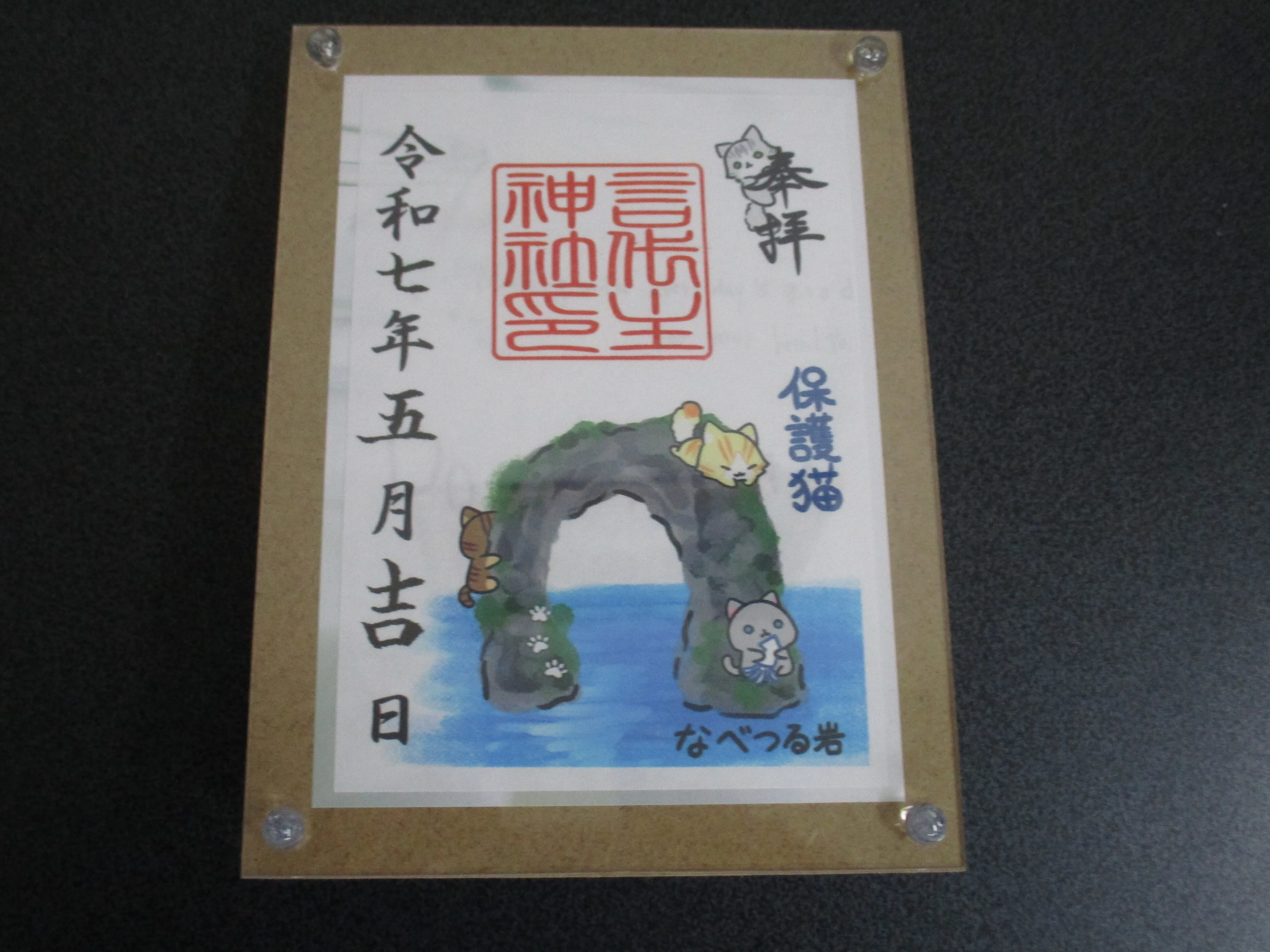 こんにちは!保護猫支援限定御朱印の1種類です、島のシンボルのなべつる岩も描かれています。報告を忘れましたが、スタートの保護猫も5匹が描かれています。5匹が島外で譲渡しました、フェリーに乗せて。今は島での去勢など春に実施予定です。もう少しの御支援をお願いします!多く野良猫を救いたいです。明上雅孝。
