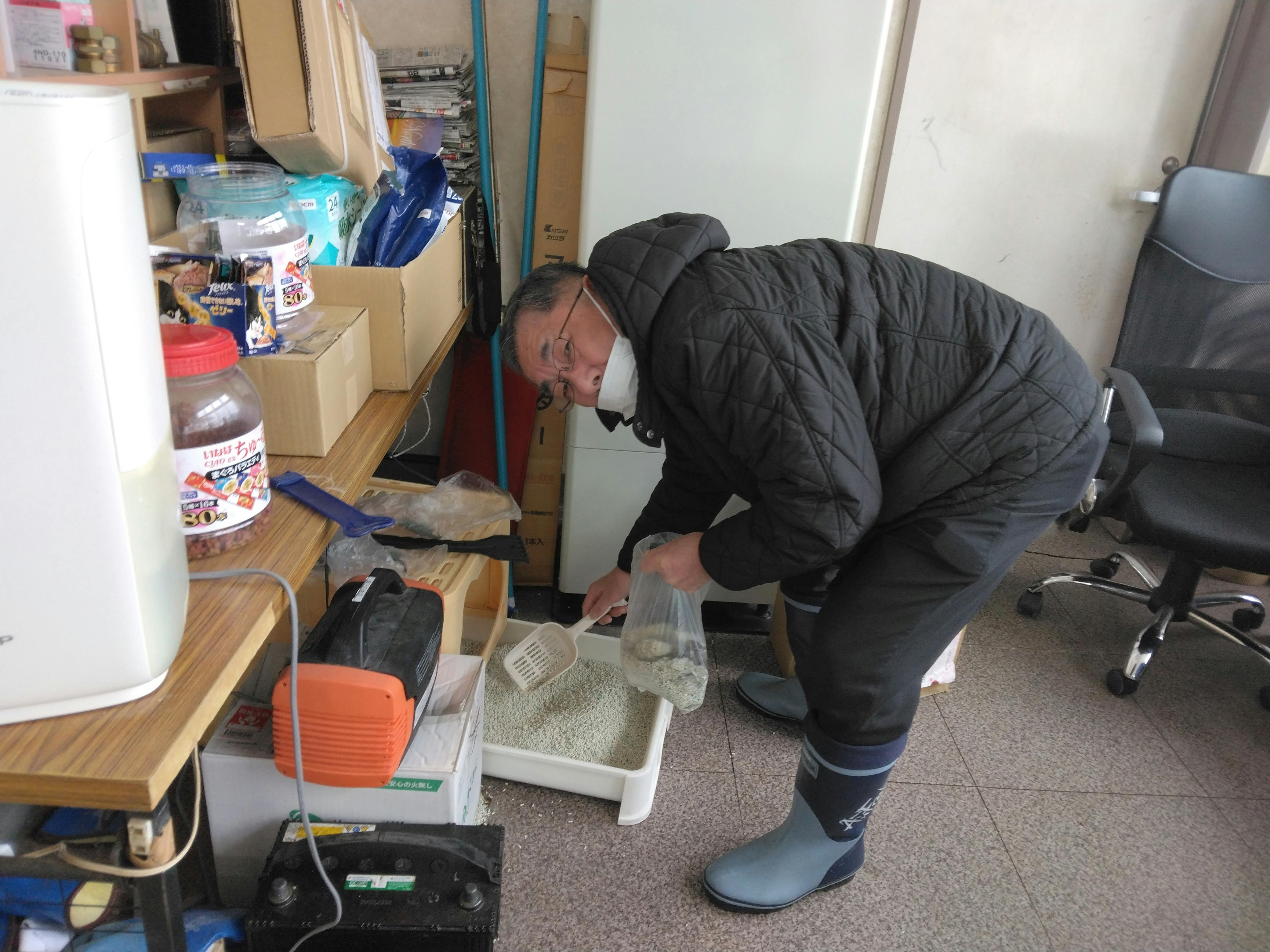 こんにちは!毎日の日課です、ネコのトイレは2個あります、会社には。エサと水の管理もあります。楽しみの一つです。春に島での去勢など100匹を目指しています。離島なので譲渡は難しいですよ、今までは23匹を譲渡しました島内外で。これだけでも60万ほどはかかりました。8匹分の支払いはまだ残っています。春に完了後に支払い予定です。楽しい私です。力をお貸し下さい。くじけません。明上雅孝。