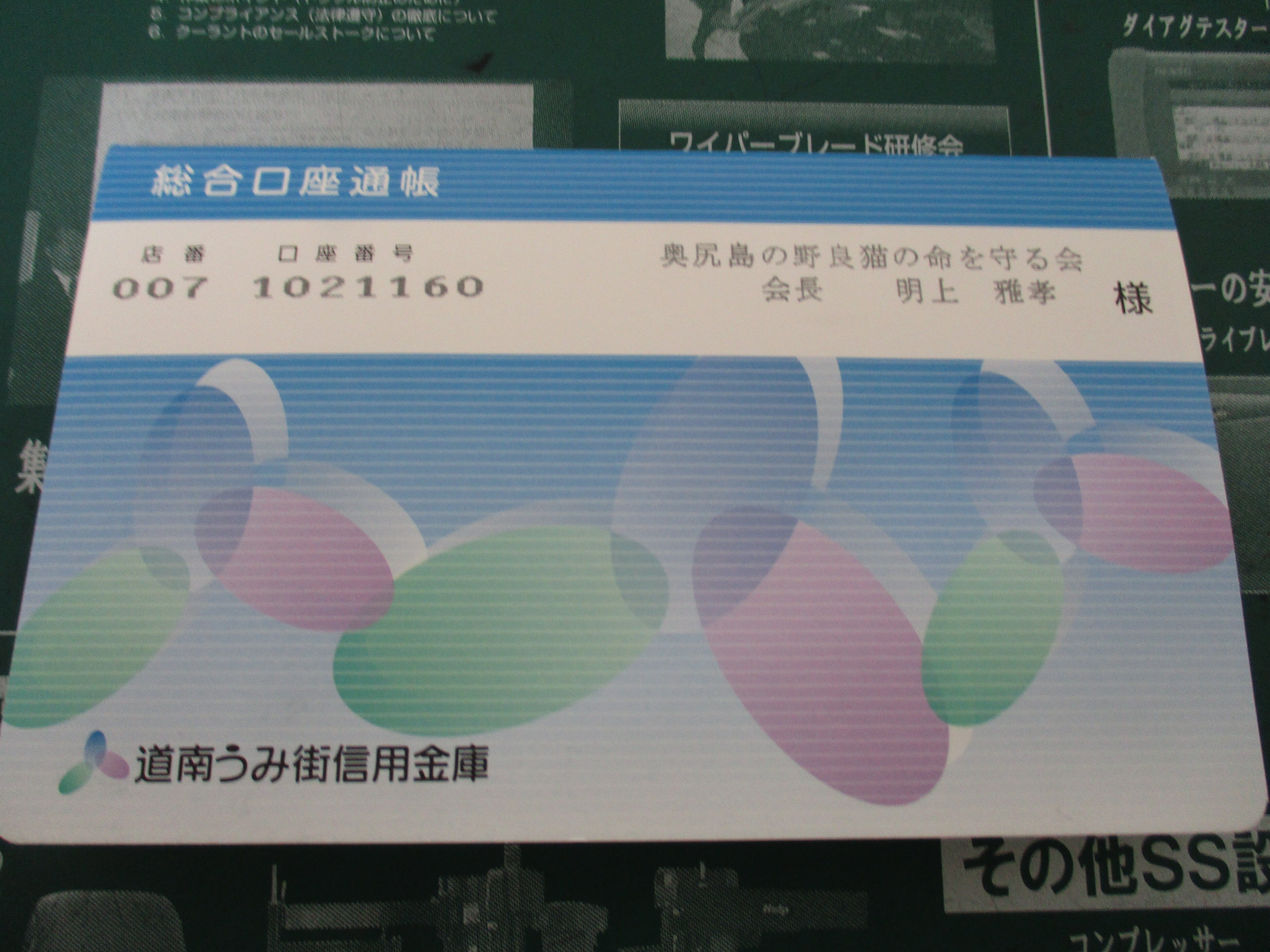 こんにちは!支援者に感謝です。今もありがたいことに地域猫の為に、この通帳への振込みがあります、地元の店から私が地域猫のエサやおやつの購入をしています。礼状もお返ししています。地域猫も70匹が島にいます、今回の保護猫活動の結果分だけでも。明上雅孝。