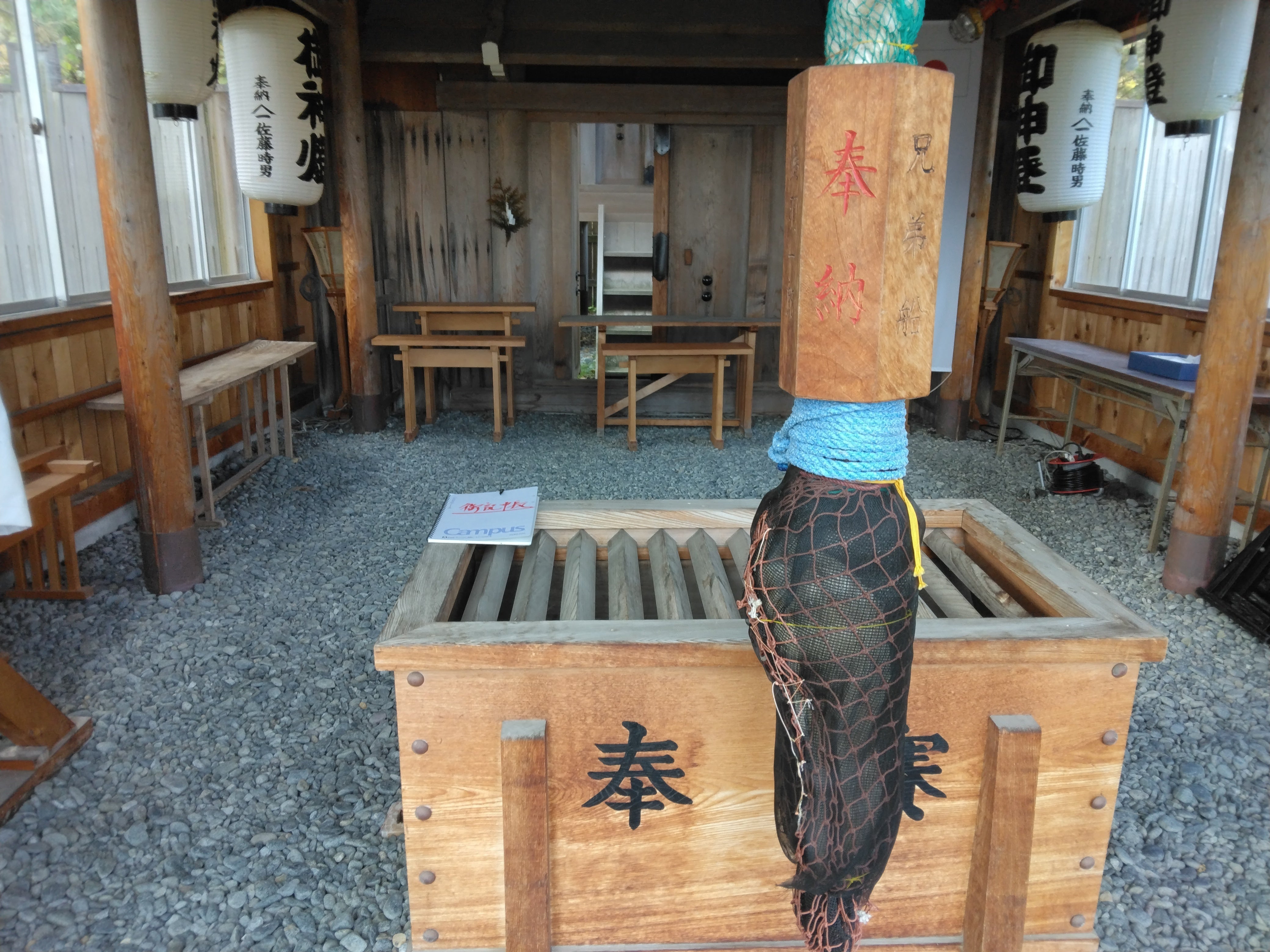 こんにちは!事代主神社の参拝時の鈴は平成8年に歌手の鳥羽一郎さんの奉納です、奉納、兄弟船、鳥羽一郎と刻まれています。目の前には音の嫌いな賽銭箱がお札をお待ちしています。御記帳にも受けた印象をお書きください。昨年から置きました。島をよくするために。島の財産を後世に残すため日々奮闘しています。力をお貸し下さい。明上雅孝。