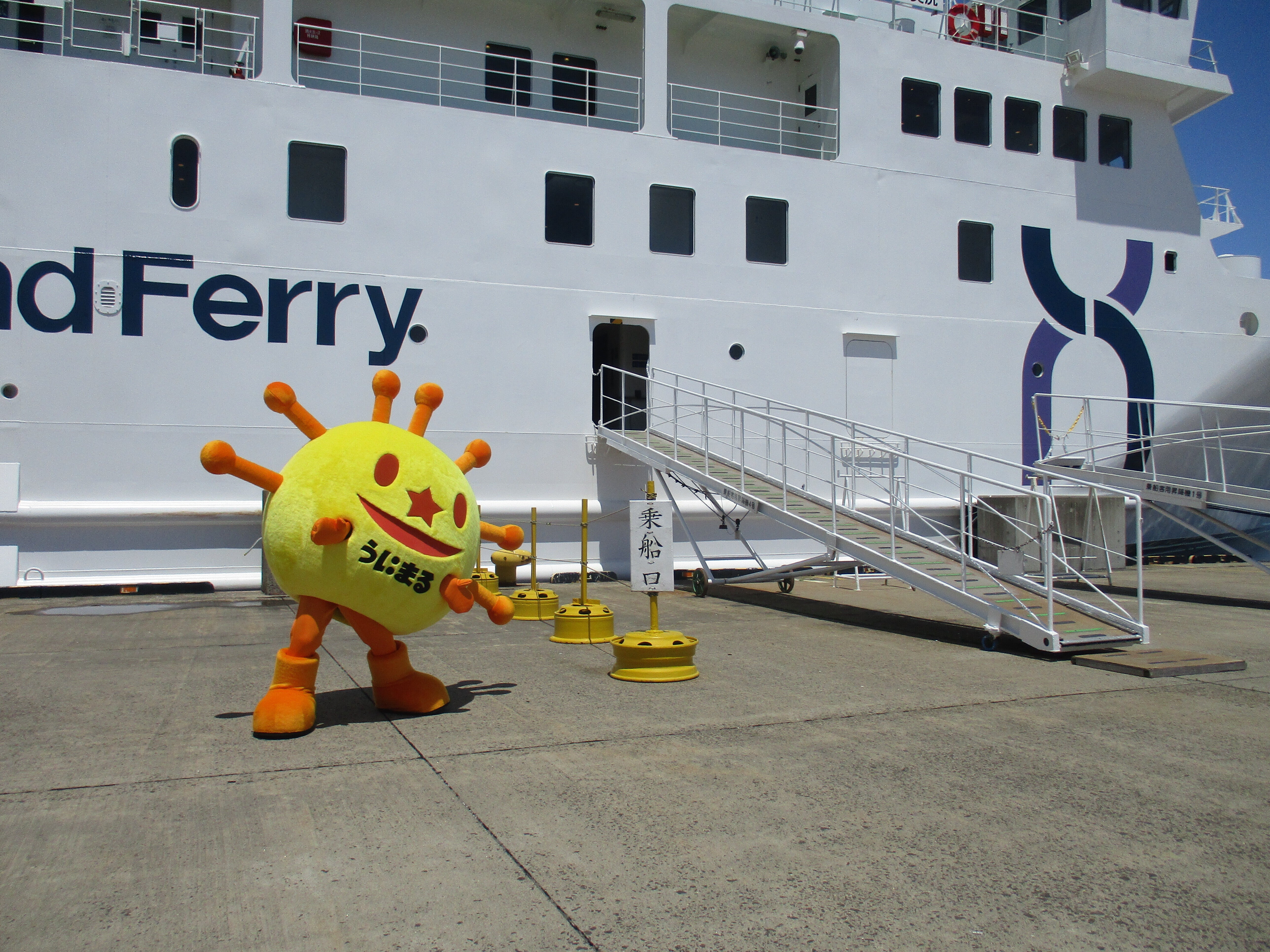 こんにちは!島と江差港を結ぶ1日1便のフェリーです、手前には昨年にクラウドファンデングで新しくなりましたウニ丸の着ぐるみです、20年ぶの交換です。本体価格は107万円でした。支援者に感謝です。明上雅孝。
