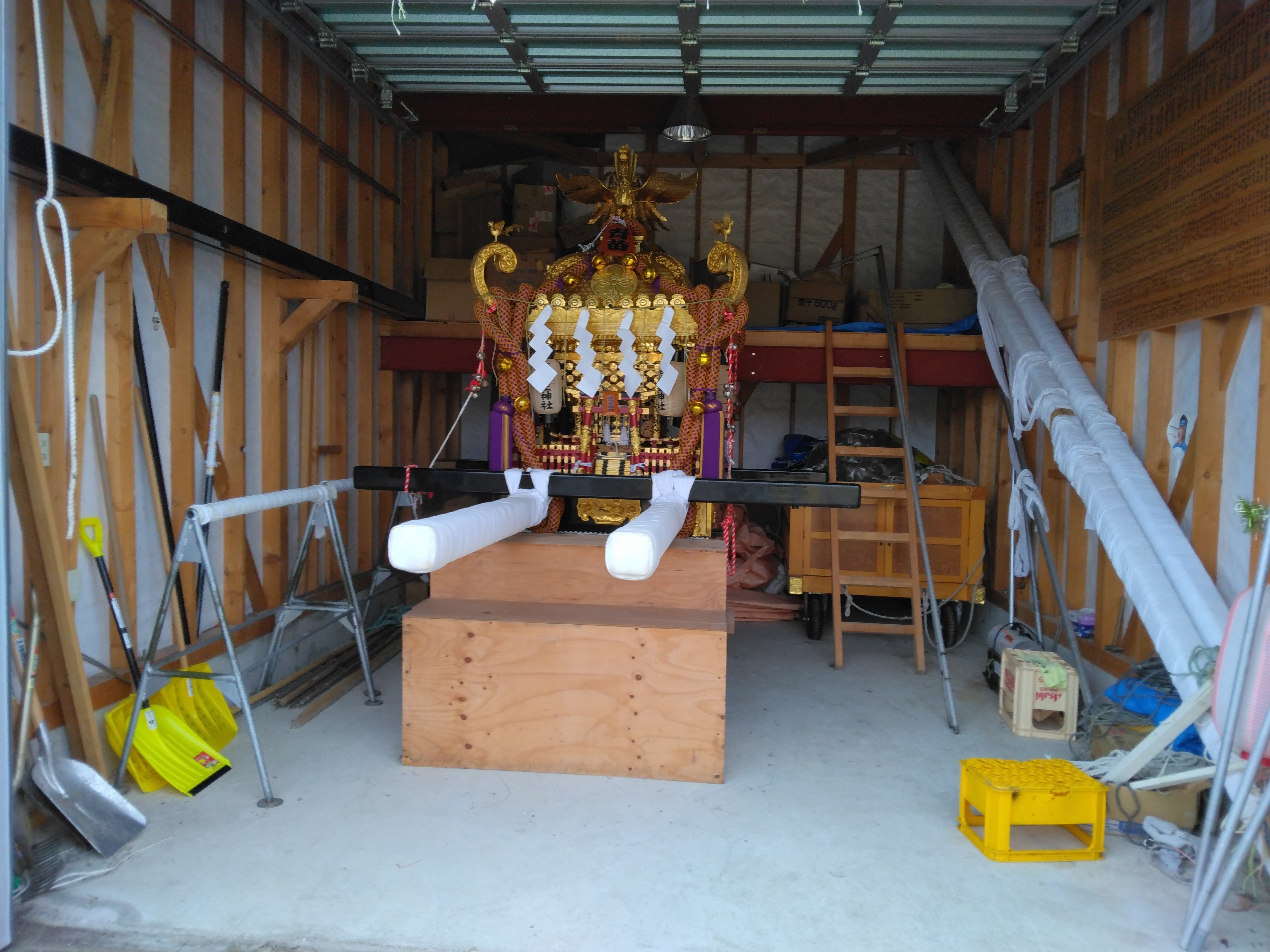こんにちは!事代主神社のお神輿です、重さ600キロを30人で担ぎます。平成13年に有志で立ち上げて製造元の富山刑務所より台車付きで850万での購入しました。地震災害が起きないように龍がナマズを抑えている、彫刻入りです。富山の南部白雲さんの作です。明上雅孝。
