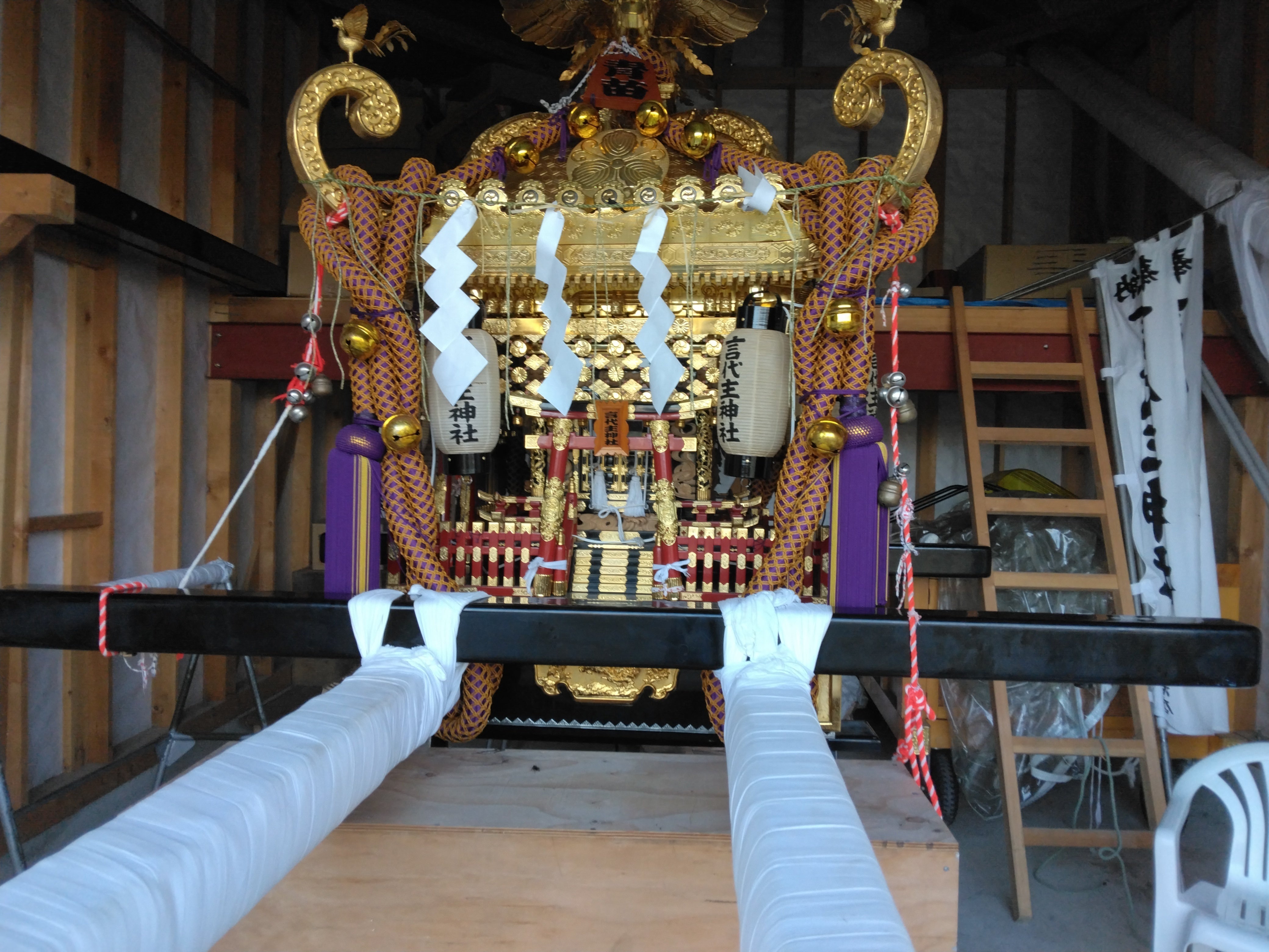こんにちは!青苗の事代主神社のお神輿です、昨年の8月の例大祭には7年ぶりに猿田彦、お神輿、山車で街を練り歩きました。今年も出来たら嬉しいです。事代主神社の総代長も神輿保存会の会長も私です。引き受け手がいません。76歳の老兵なのに。明上雅孝。