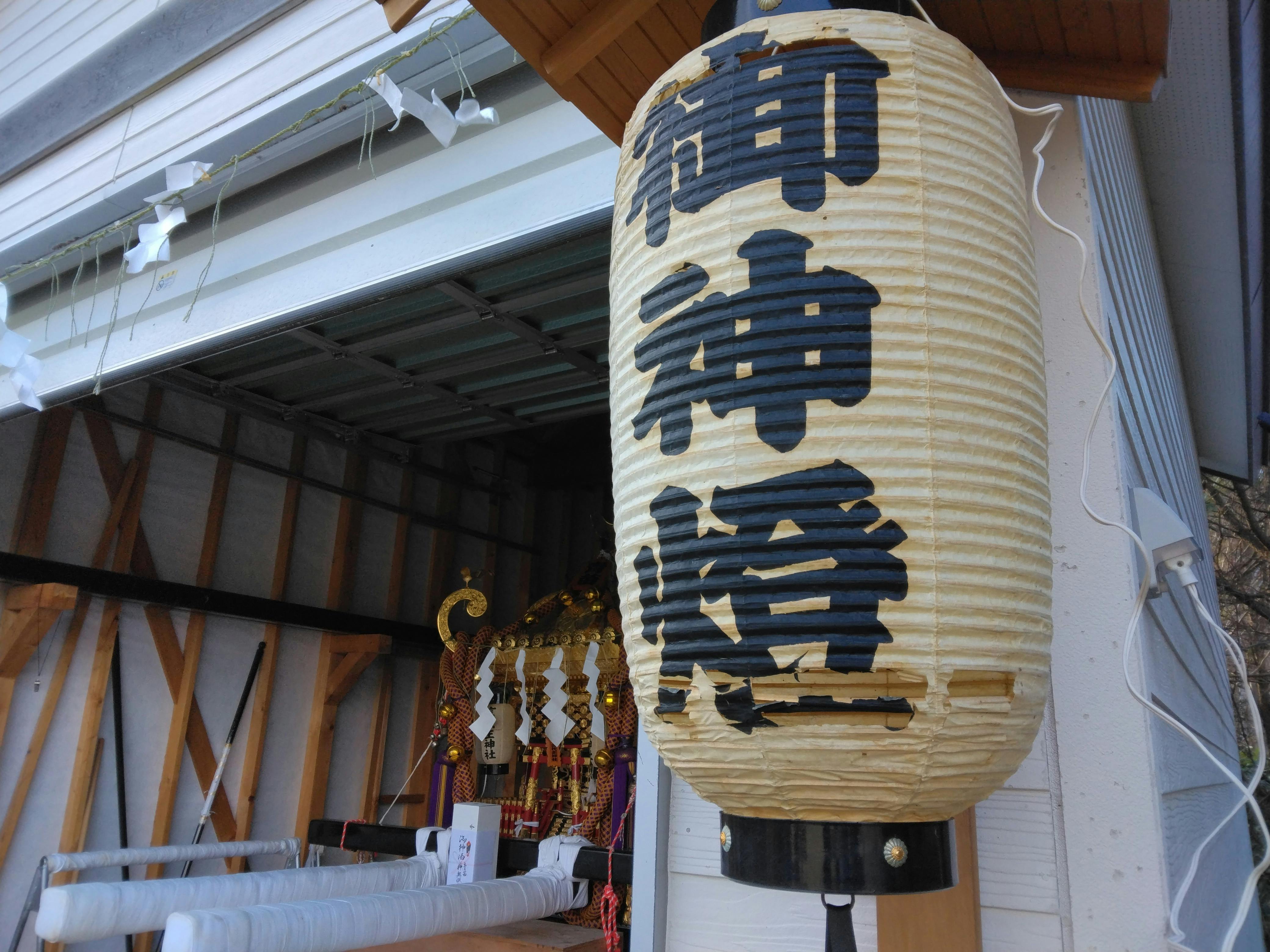 こんにちは!お神輿の倉庫前の提灯も2個破損です、60センチ位です。お神輿は平成13年に製造元の富山刑務所寄りの購入です。提灯は年に数回だけしか掛けないのですが、青苗は風と塩害が強いですよ。今は事代主神社の運営費を募集しています。備品の提灯も10個交換します。明上雅孝。