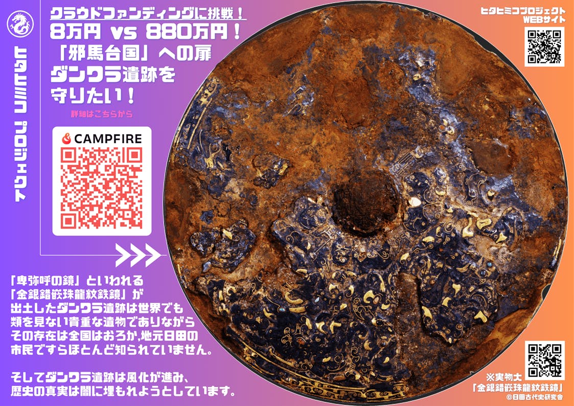 2025/07/03 06:30―「不可能」が「現実」へ変わる瞬間、ダンワラ遺跡に希望の光が差しました―拝啓日頃よりヒタヒミコプロジェクトの活動に温かいご理解とご支援を賜り、心より御礼申し上げます。このたび私たちは、ダンワラ遺跡の保全と活用を目指したクラウドファンディング企画「8万円 vs 880万円!?『邪馬台国』への扉 幻の遺跡 ダンワラを守りたい!」において、目標金額50万円の達成をご報告できることとなりました。ご支援くださった延べ80名の皆さま、本当にありがとうございます。■ 「無理だ」という声を越えて立ち上げ当初、私たち自身の胸の内にも、迷いがなかったとは言えません。わずか8万円の初期資金。保全にはおよそ880万円が必要。「本当にできるのか」「やる意味はあるのか」と、葛藤もありました。それでも、皆さまのひとつひとつの応援が、私たちの背中を押してくれました。皆様から頂いた応援のメッセージは、本当に暖かく、心に染み入るものばかりでした。いただいたご支援は単なる金額だけではなく、「あきらめないで」というエールそのものだったのです。■ 遺跡が動き出す。未来が形になる。2025年5月10日、総勢20名のボランティアと地元住民の皆さまと共に、ダンワラ遺跡の清掃活動を実施いたしました。長年、竹林と泥に埋もれていたその姿が、少しずつ蘇っていく光景は、胸を打つものでした。この取り組みは、大分合同新聞、西日本新聞、KCVコミュニケーションズなどのメディアにも取り上げられ、多くの方々に「ダンワラの再発見」を知っていただくきっかけとなりました。■Amazon歴史学部門で【新着第1位】さらに5月9日には、私たちの研究成果をまとめた書籍『シン邪馬台国Ⅰ 金銀錯嵌珠龍文鉄鏡』(Kindle版)がAmazon歴史学部門で【新着第1位】を獲得。活動の信頼性と注目度が、確かな形で示されたことは何よりの励みです。https://www.amazon.co.jp/%E3%82%B7%E3%83%B3%E9%82%AA%E9%A6%AC%E5%8F%B0%E5%9B%BD-%E2%85%A0-%E9%87%91%E9%8A%80%E9%8C%AF%E5%B5%8C%E7%8F%A0%E9%BE%8D%E6%96%87%E9%89%84%E9%8F%A1-%E5%A4%A7%E6%B3%A2%E7%BE%85-%E6%9C%AB%E6%A0%84-ebook/dp/B0F5GW8RL1■ ご支援金の使途について皆様からお預かりした大切なご支援は、以下の目的で有効に活用させていただきます。重機を使った竹林伐採・整備作業産業廃棄物の適正処理清掃活動時のボランティア支援(お弁当・飲料など)盗掘・破壊防止のための監視カメラ設置すべてが、未来へとつながる一歩です。ダンワラ遺跡が再び歴史の表舞台に立ち、人々の記憶に残る“地域の宝”となる日を目指して、責任を持ってプロジェクトを進めてまいります。■ この物語を一緒に紡いでくださった皆様へ皆さま一人ひとりが、このプロジェクトの「主人公」です。誰よりも歴史に情熱を持ち、希望を信じて支援くださった皆さまは、私たちにとっての“シュリーマン”であり、“探求の同士”です。かつて失われ、埋もれかけた歴史が、今まさに皆さまの手によって掘り起こされつつあります。■ 最後にこのクラウドファンディングは、単なる一過性の支援活動ではありません。まるで年輪のように、少しずつ積み重ね、広がっていく――「未来に続く活動の第一歩」として、私たちは今後も歩みを止めません。進捗は随時ご報告いたしますので、引き続き、温かく見守っていただけましたら幸いです。皆様のご支援に、改めて心より御礼申し上げます。ありがとうございました。敬具ヒタヒミコプロジェクト 一同 もっと見る【活動報告】ダンワラ遺跡を未来へ!ボランティア清掃活動を実施し、メディアにもご注目いただきました!
