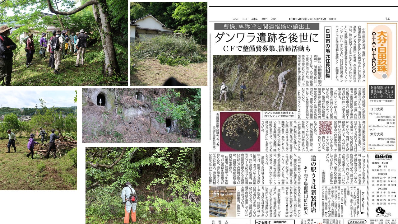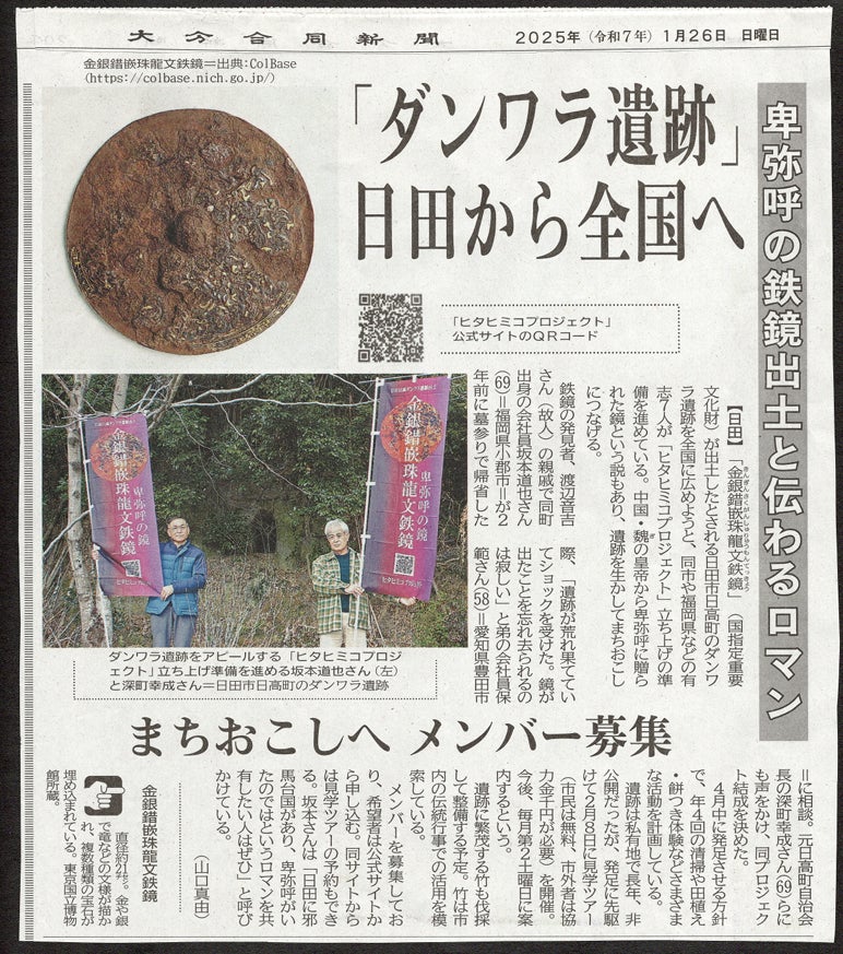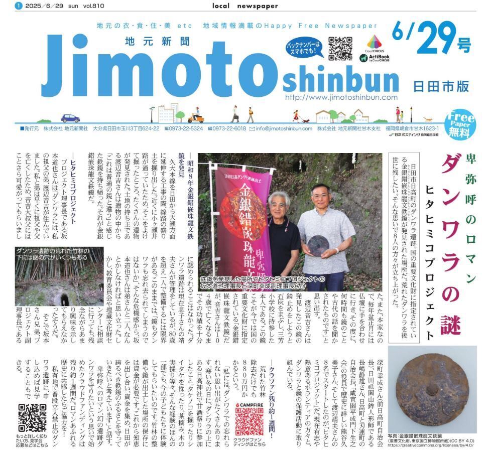 2025/05/24 08:00日頃より「ヒタヒミコプロジェクト」にご関心をお寄せいただき、誠にありがとうございます。この度、先日5月10日(土)、日田市日高町の「ダンワラ遺跡」におきまして、ボランティアの皆様、そして地元住民の方々と共に清掃活動を実施いたしましたことをご報告申し上げます。当日は、ボランティア14名と地元住民6名の総勢20名もの方々にご参加いただきました。皆様には、国重要文化財「金銀錯嵌珠龍紋鉄鏡(きんぎんさくがんしゅりゅうもんてっきょう)」が出土したこの歴史的な地で、風雨や竹林の浸食から遺跡を守るため、貴重なお時間を割いて汗を流していただきました。遺跡周辺に生い茂った草木や、岩肌を覆うツタなどを丁寧に手作業で取り除き、貴重な遺跡の姿を少しでも明瞭にできるよう努めました。こうして多くの方々にご協力いただけることが、私たちにとって何よりの励みとなっております。心より感謝申し上げます。早速、ご支援は参加者様へ、飲み物、お弁当代、そして保険費用にあてさせていただきました。また、当日の活動の様子につきましては、大分合同新聞社様、西日本新聞社様、そして地元ケーブルテレビ、KCVコミュニケーションズ様にも取材にお越しいただきました。メディアを通じて、より多くの方々にダンワラ遺跡の魅力と私たちの活動を知っていただく機会をいただけたことに、重ねて御礼申し上げます。清掃活動と合わせて開催いたしました遺跡ツアーでは、ご参加いただいた皆様に、ダンワラ遺跡が秘める歴史的価値やロマンに直接触れていただく良い機会となりました。今回の清掃活動は、貴重なダンワラ遺跡を維持管理し、その歴史的価値を未来へ発信していく上での大切な一歩です。今後も、皆様のお力をお借りしながら、この遺跡を後世へと繋いでいくための活動を継続してまいります。引き続き、「ヒタヒミコプロジェクト」の活動にご注目いただければ幸いです。ヒタヒミコプロジェクト メンバー一同 もっと見る長年の研究と情熱を込めた書籍『シン邪馬台国 Ⅰ 金銀錯嵌珠龍文鉄鏡』(Kindle版)が発売!