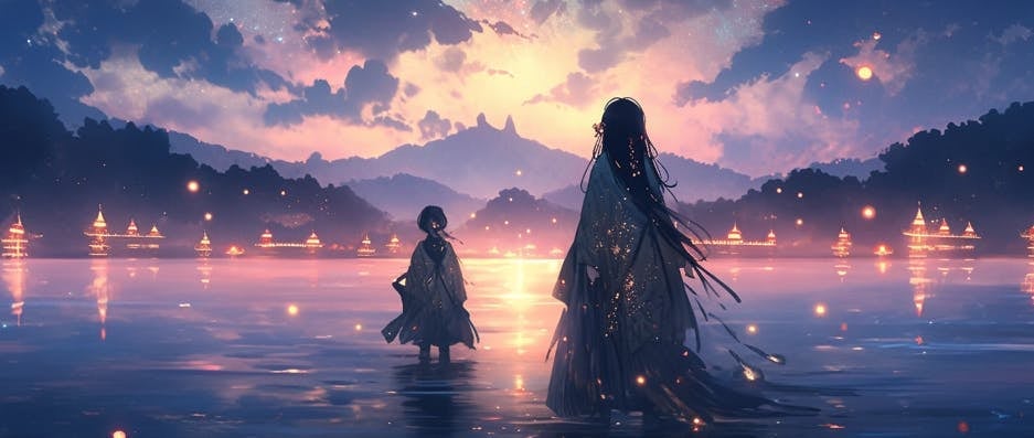 日田湖にたたずむ、幼い台与と卑弥呼(イメージ図)