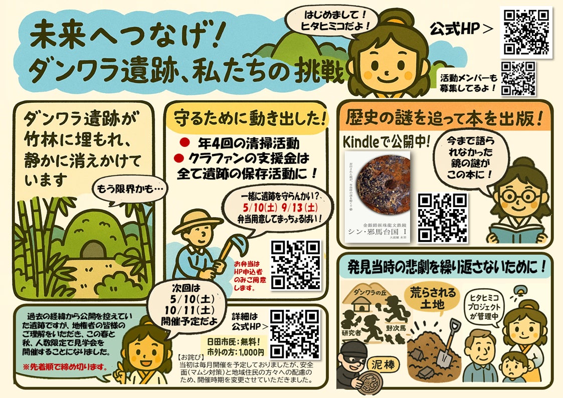 この度、「日田の歴史を、未来へ。」を合言葉に活動する私たち「ヒタヒミコプロジェクト」は、所有者である渡辺様の深いご理解と多大なるご協力、そして郷土の歴史を伝えたいという熱意のもと、長年固く守られてきたこのダンワラ遺跡の特別限定見学会を実施する運びとなりました。