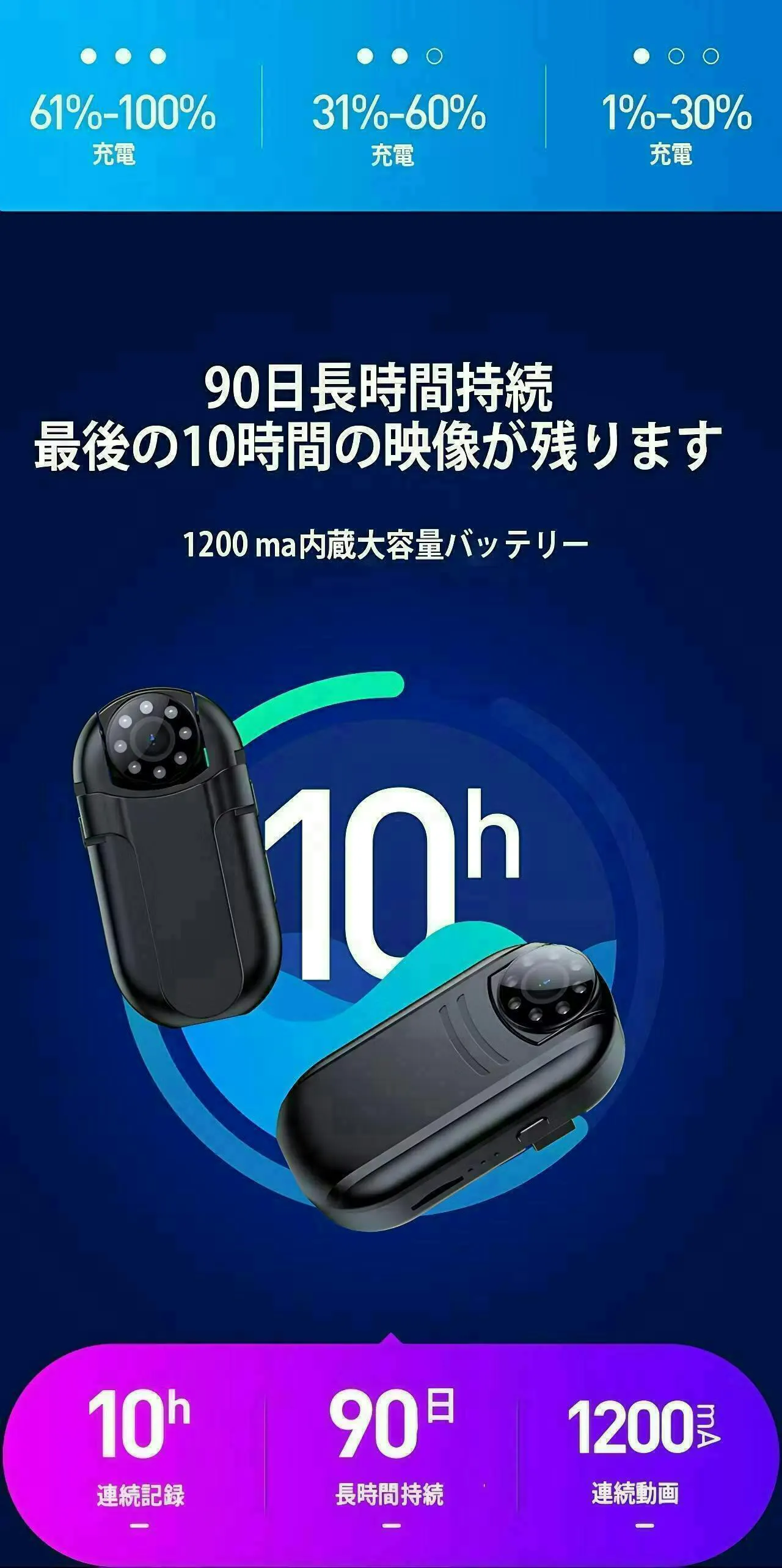 1200maの大容量のバッテリーを内蔵しているため10時間連続録画、電源が最大90日間持続可能です。