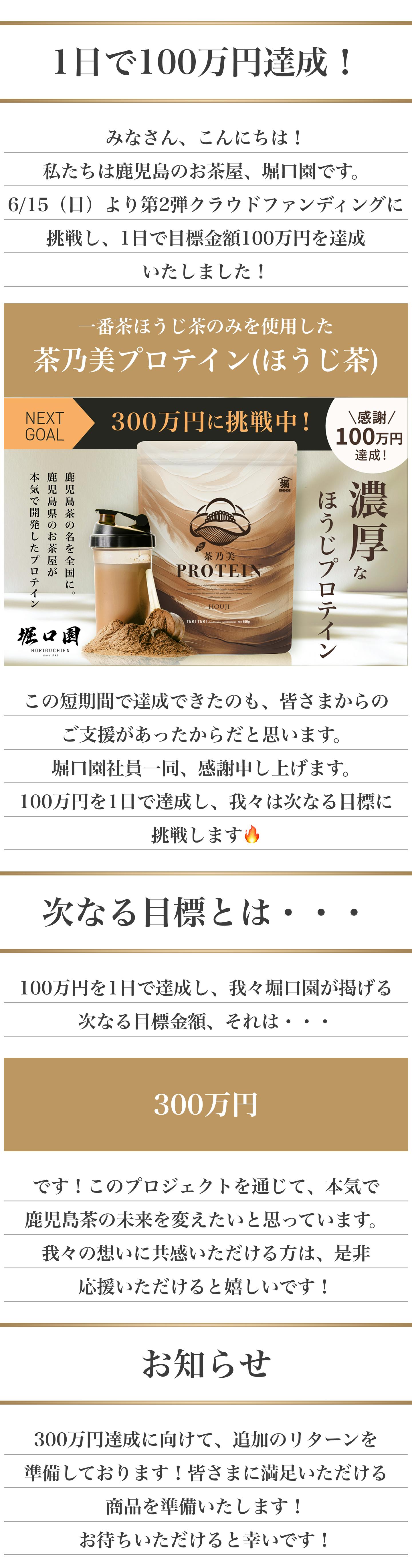 荒茶生産量が日本一となった鹿児島茶の魅力・美味しさを広めたい!そして新たなお茶の楽しみ方に触れ、加速するお茶離れを食い止めたい!そんな想いから、第2弾プロダクト『茶乃美プロテイン(ほうじ茶)』を鹿児島の新参茶屋が本気で開発。鹿児島茶の魅力を広め、お茶の明るい未来を切り拓くために、力を貸してください!