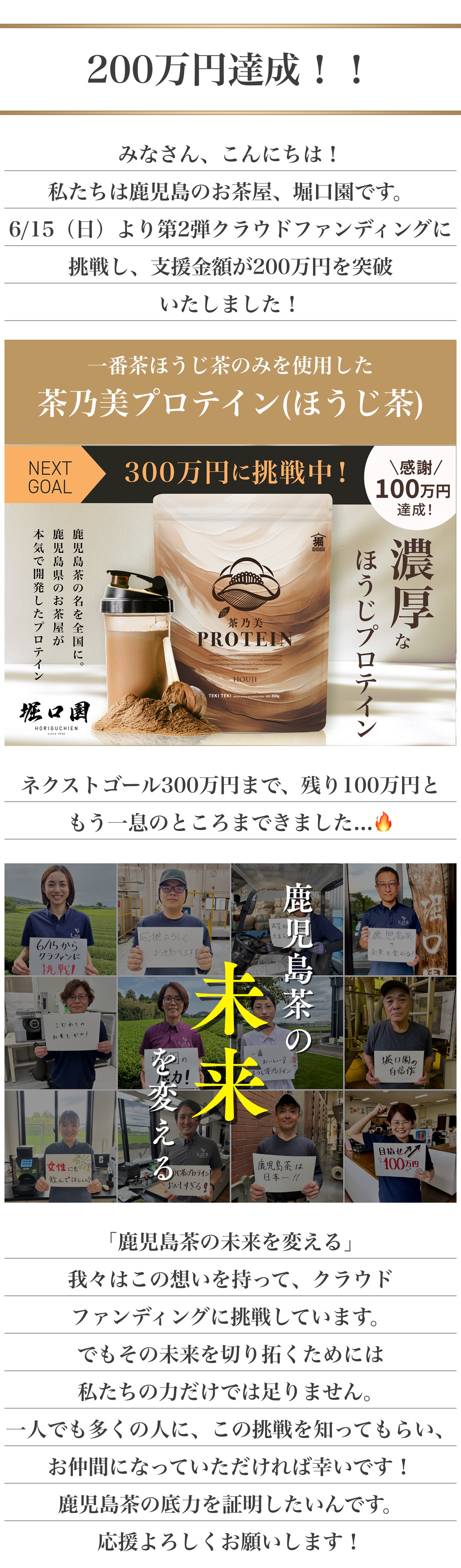 荒茶生産量が日本一となった鹿児島茶の魅力・美味しさを広めたい!そして新たなお茶の楽しみ方に触れ、加速するお茶離れを食い止めたい!そんな想いから、第2弾プロダクト『茶乃美プロテイン(ほうじ茶)』を鹿児島の新参茶屋が本気で開発。鹿児島茶の魅力を広め、お茶の明るい未来を切り拓くために、力を貸してください!