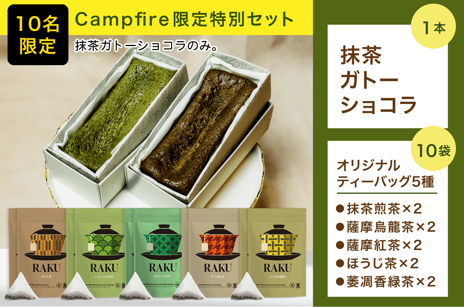 【10名限定・Campfire限定特別セット発売】\大好評の「茶乃美プロテイン」クラウドファンディングにて/数量限定・特別セットが登場しました!今回ご用意したのは、抹茶ガトーショコラ×RAKUティーバッグ詰め合わせセット。濃厚な旨みと香りが魅力の《抹茶ガトーショコラ》を1本。※本格抹茶を贅沢に練り込んだ、しっとり濃厚スイーツ。(ご提供:pono cafe様)さらに、堀口園が誇るRAKUティーバッグ(5種×2袋・計10袋)もセットでお届け!・抹茶煎茶・薩摩烏龍茶・薩摩紅茶・ほうじ茶・菱潤香緑茶10名様限定、Campfireでしか手に入らない特別な詰め合わせ。お茶スイーツと本格ティータイムの贅沢コラボを、ぜひお楽しみください。
