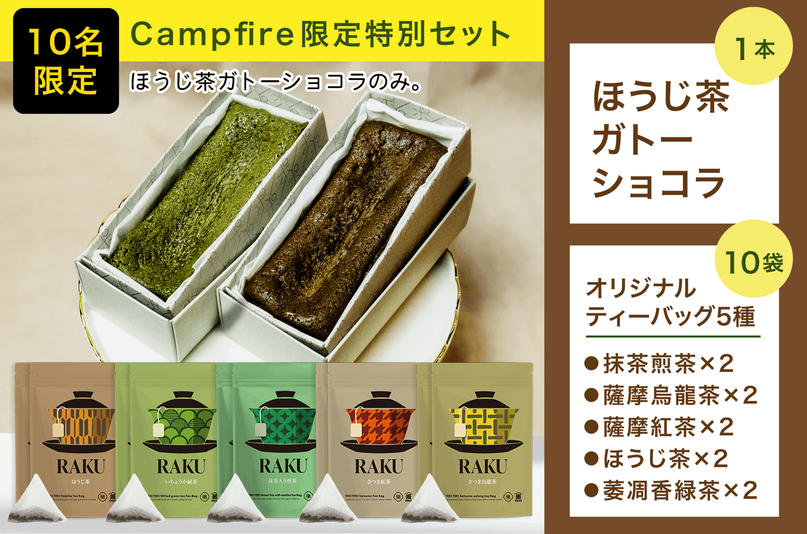 【10名限定・Campfire限定特別セット発売】\大好評の「茶乃美プロテイン」クラウドファンディングにて/数量限定・特別セットが登場しました!今回ご用意したのは、ほうじ茶ガトーショコラ×RAKUティーバッグ詰め合わせセット。濃厚な旨みと香りが魅力の《ほうじ茶ガトーショコラ》を1本。※本格ほうじ茶を贅沢に練り込んだ、しっとり濃厚スイーツ。(ご提供:pono cafe様)さらに、堀口園が誇るRAKUティーバッグ(5種×2袋・計10袋)もセットでお届け!・抹茶煎茶・薩摩烏龍茶・薩摩紅茶・ほうじ茶・菱潤香緑茶10名様限定、Campfireでしか手に入らない特別な詰め合わせ。お茶スイーツと本格ティータイムの贅沢コラボを、ぜひお楽しみください。