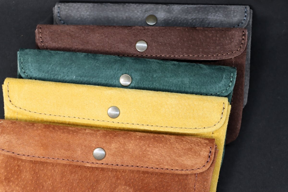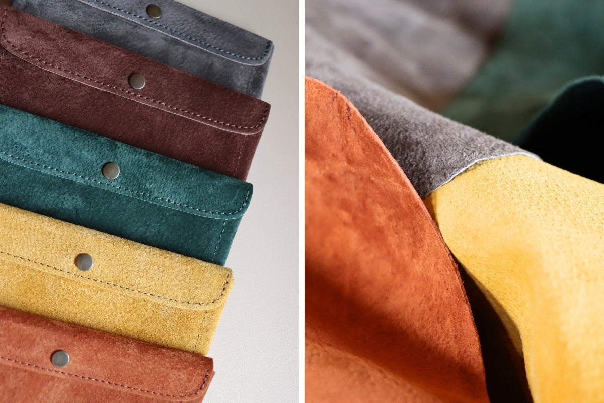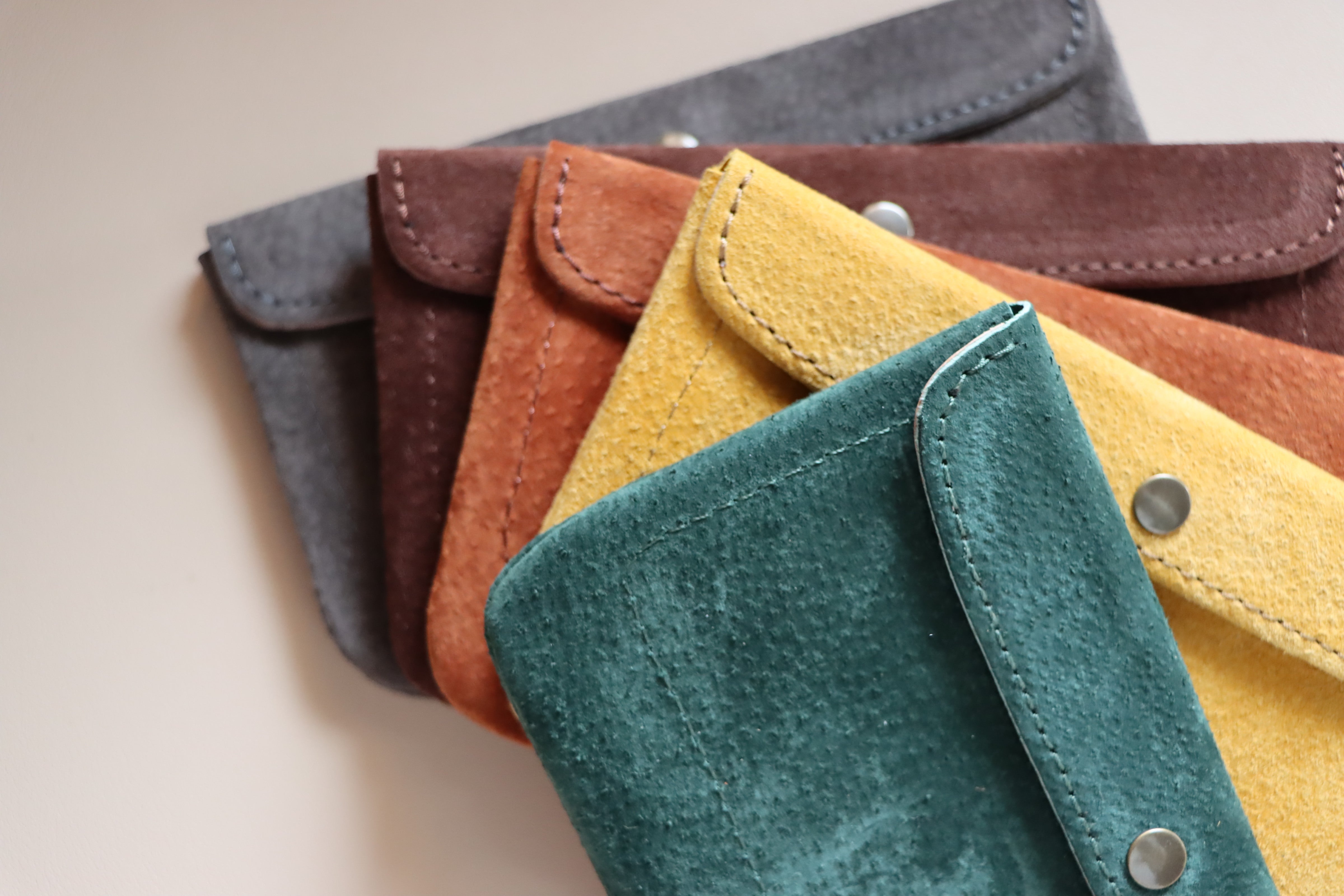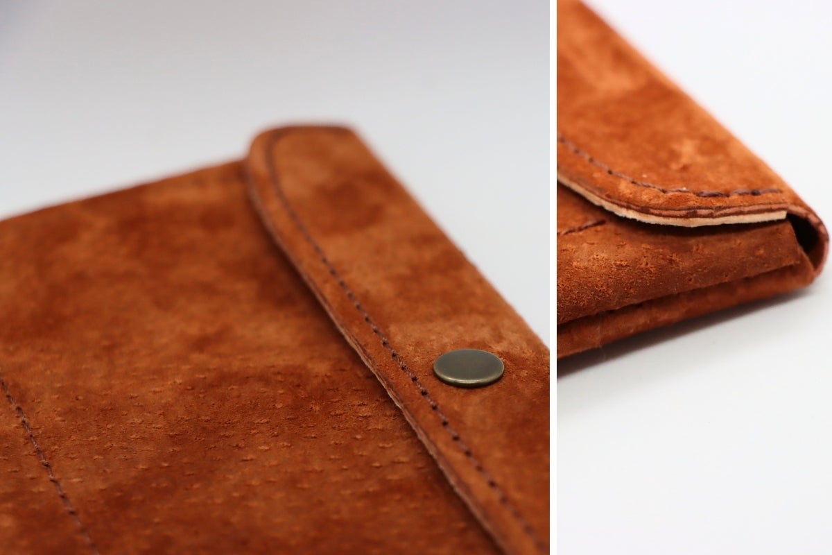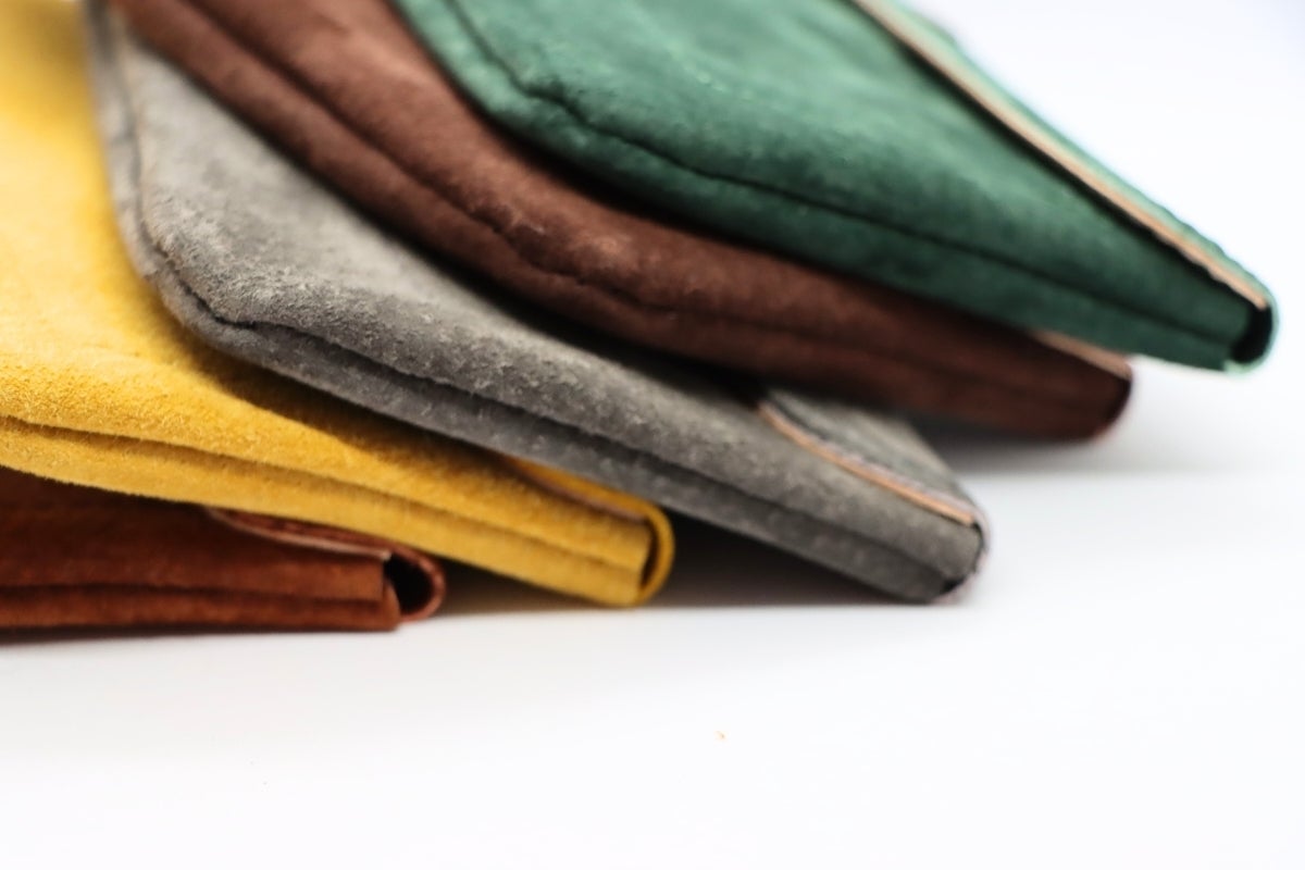その特性は、軽さと強さの両立。薄くしても強度を保てるため、無駄な厚みを省きながら、耐久性を確保できます。スエード仕上げによる上品なマットな質感は、シンプルなデザインと相性抜群。「本当にちょうどいい財布」を目指し、選び抜いた素材です。